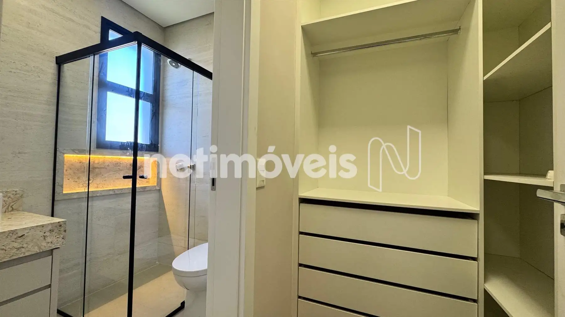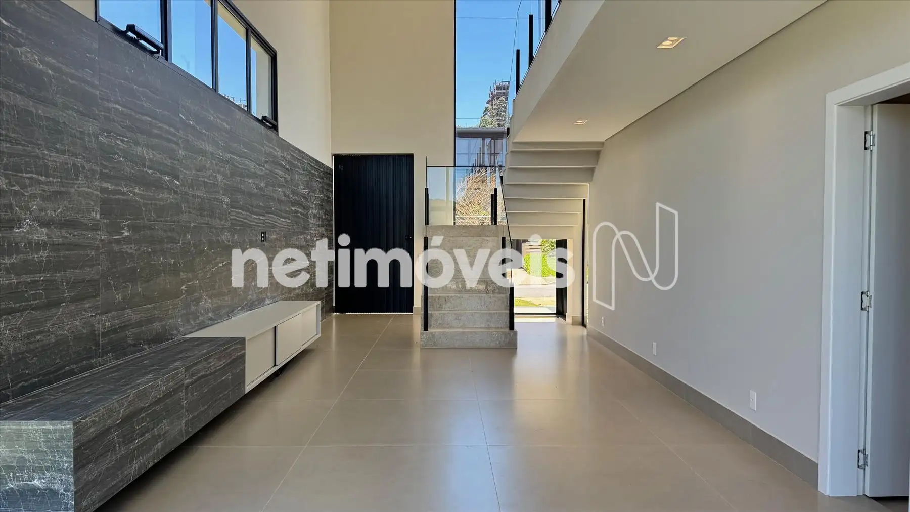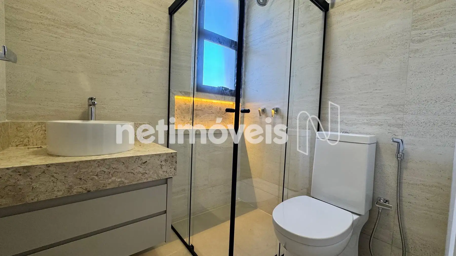 As esquadrias pretas destacam as linhas do projeto, criando contraste e modernidade. O travertino aparece como elemento nobre, trazendo textura e elegância para os ambientes. A iluminação intimista valoriza cada espaço, criando atmosferas acolhedoras e destacando o design único da casa.