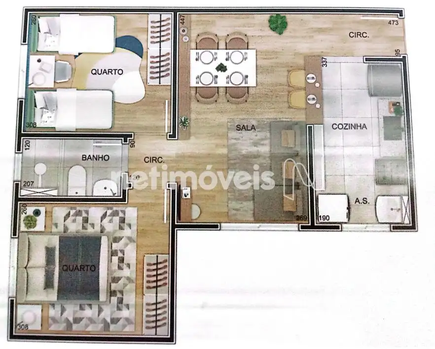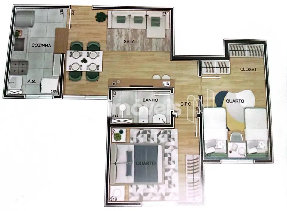 Pisos: Laminado de madeira nos quartos e sala e porcelanato na cozinha e banho.