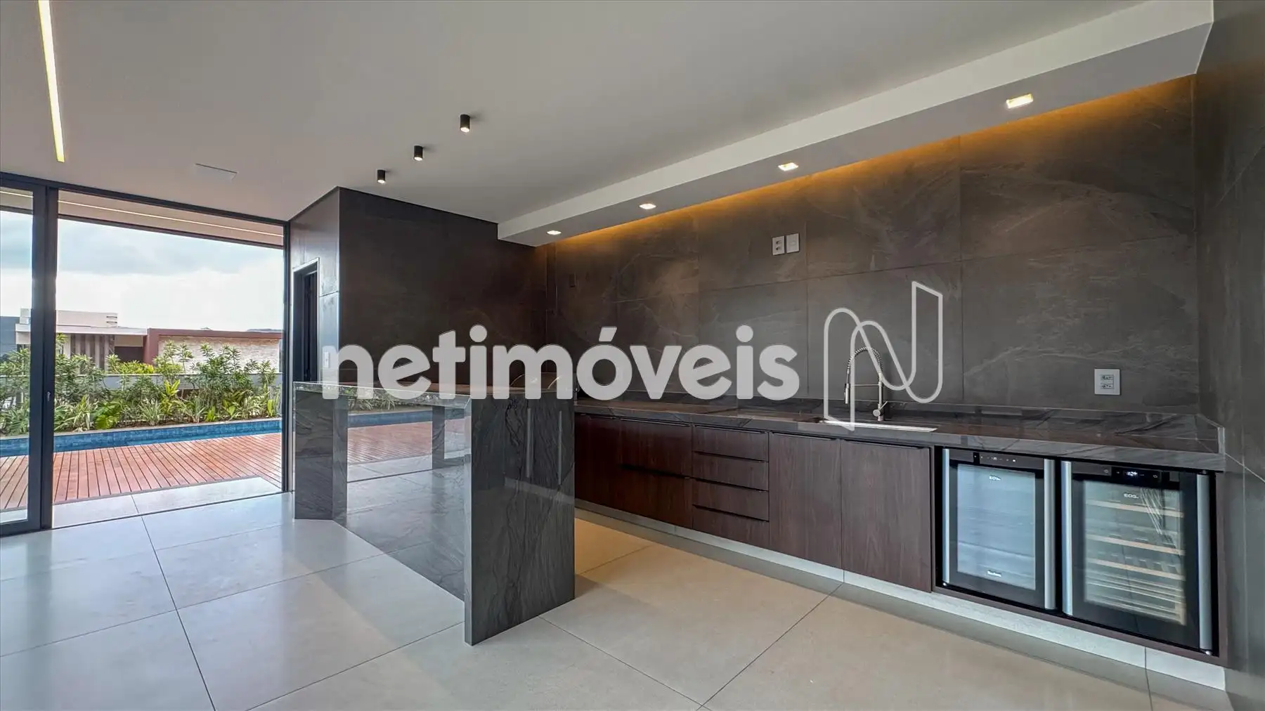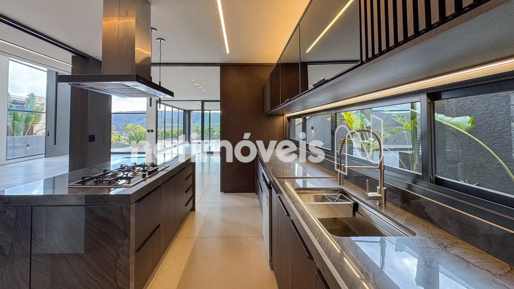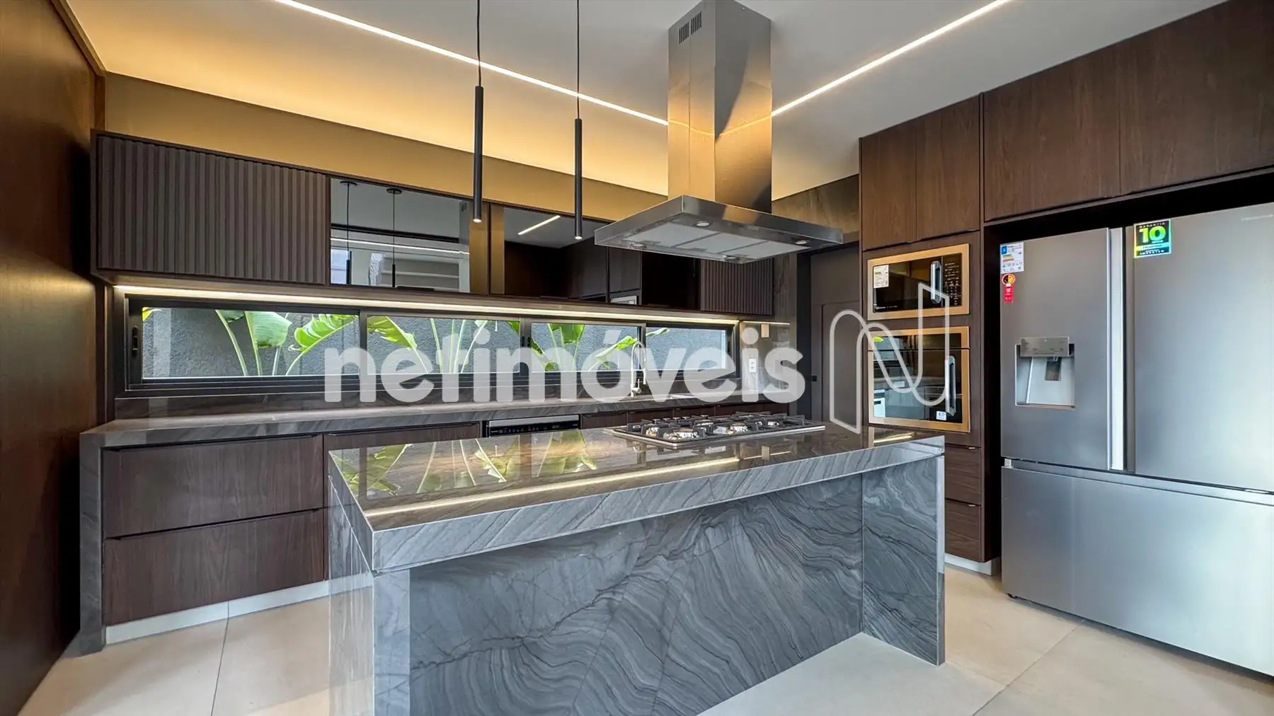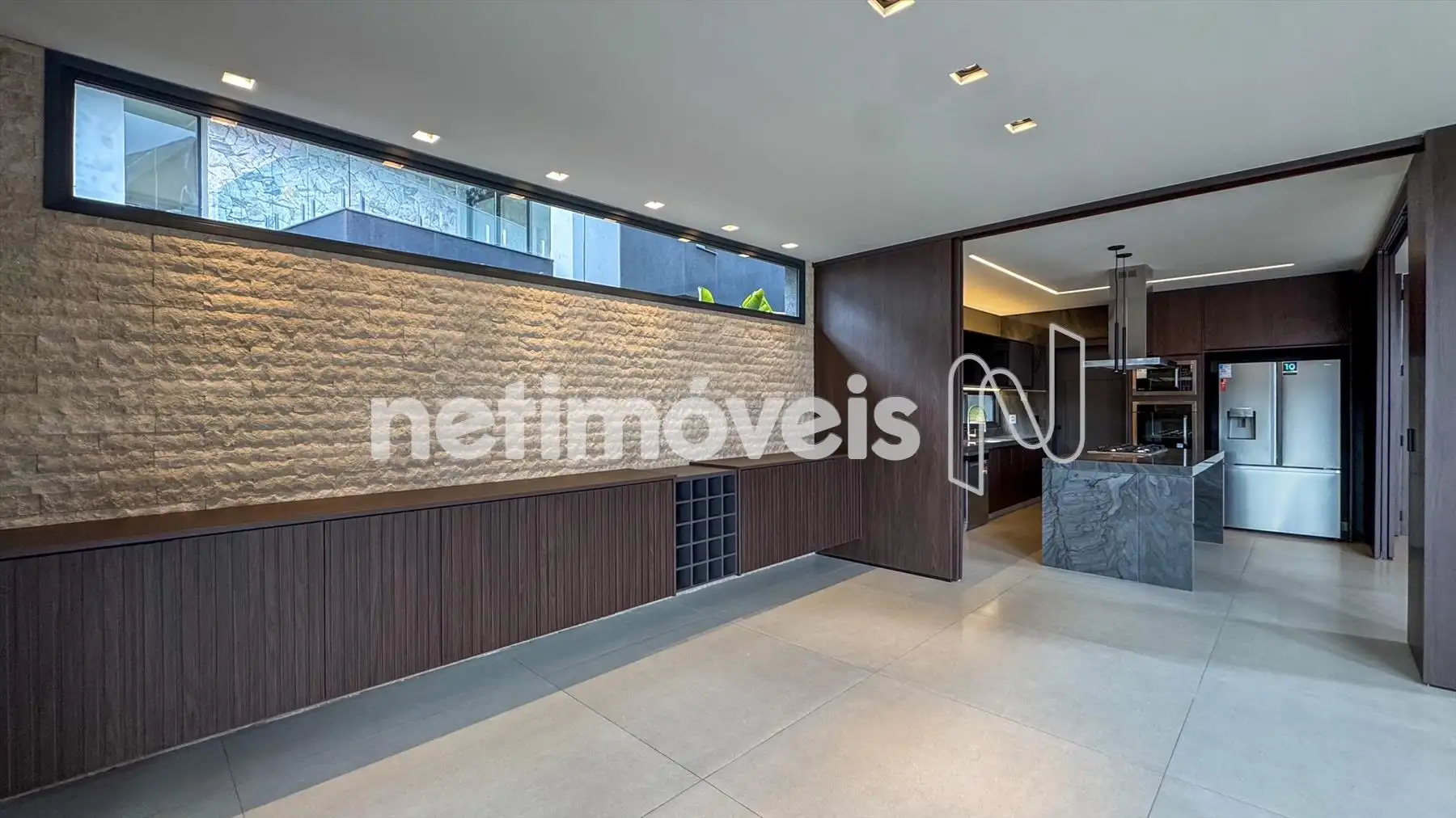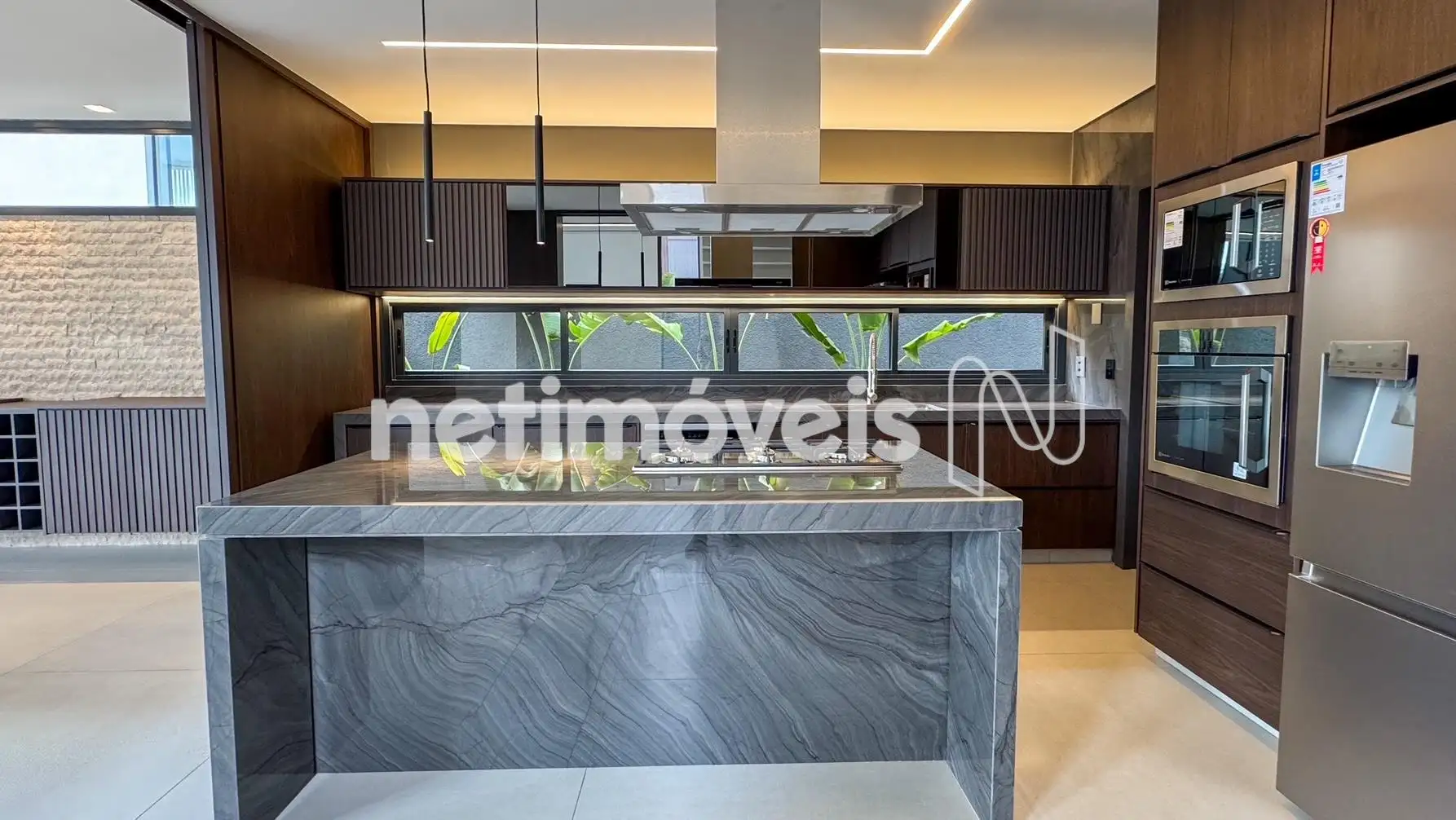 Cozinha integrada, equipada com marcenaria sob medida e bancadas em quartzito Wakanda.