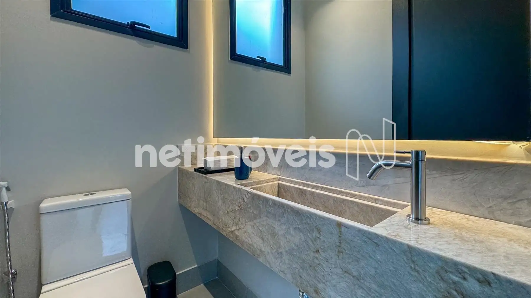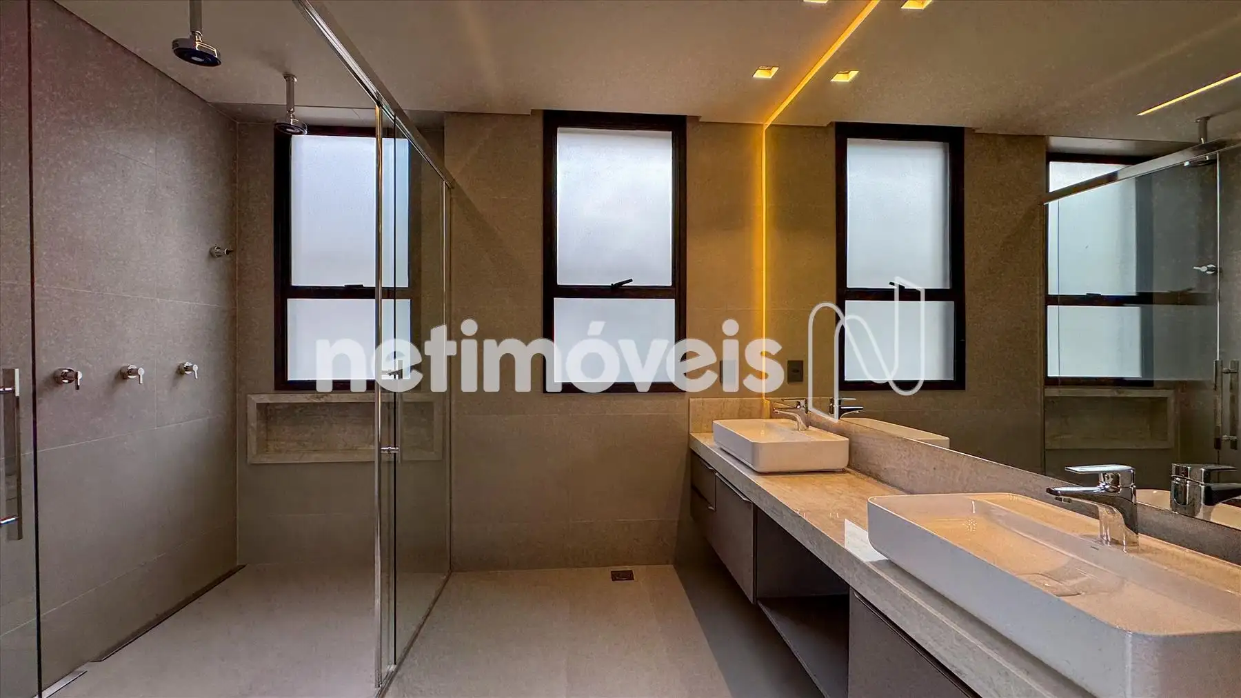 Banheiros revestidos em porcelanato, com bancadas em quartzito Taj Mahal.