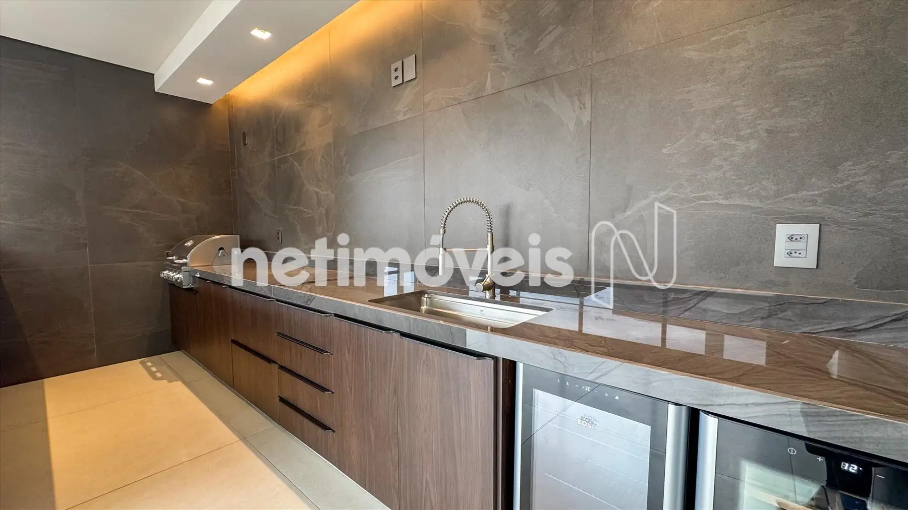 Espaço gourmet sofisticado, com bancadas esculpidas em quartzito Taj Mahal.
