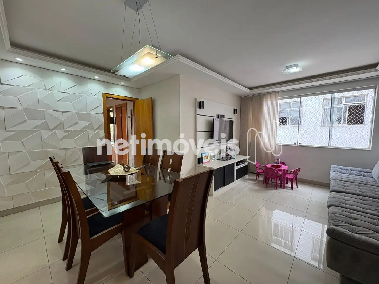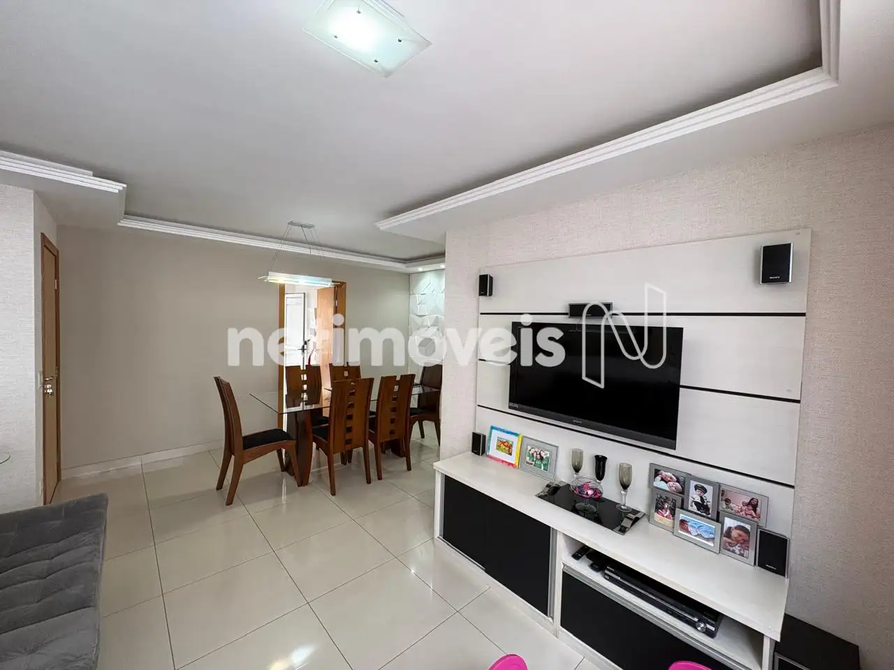 Sala para 02 ambientes com teto rebaixado e painel de TV.