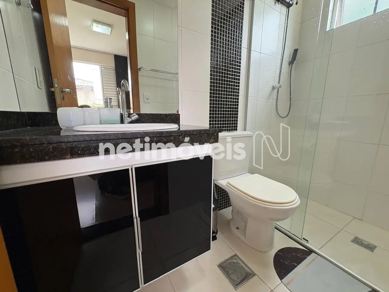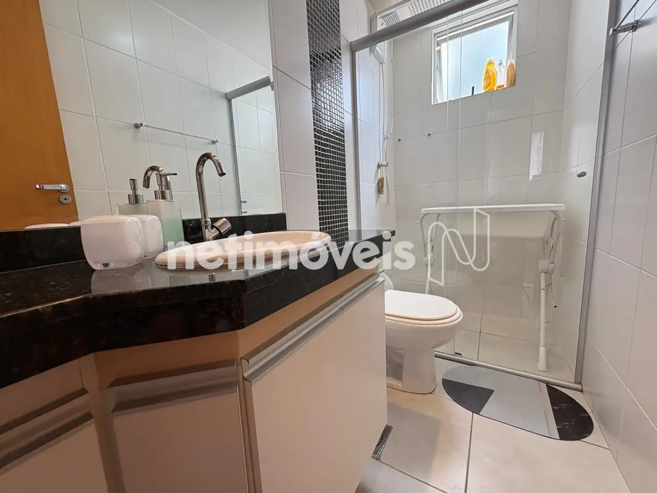 Banho social e suíte com armário e box em vidro temperado.
