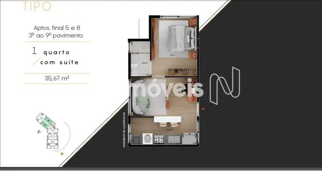 Área privativa Sala integrada com cozinha compacta 02 quartos sendo 01 suíte com acabamento de alto padrão.