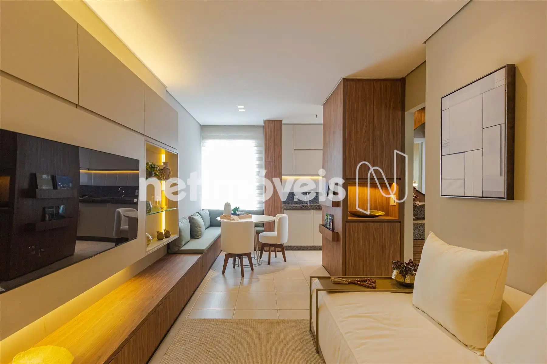 * Sala para 02 ambientes com piso em porcelanato, sofá, mesa, 02 cadeiras, frigobar, tapete, cortina, painel e TV;