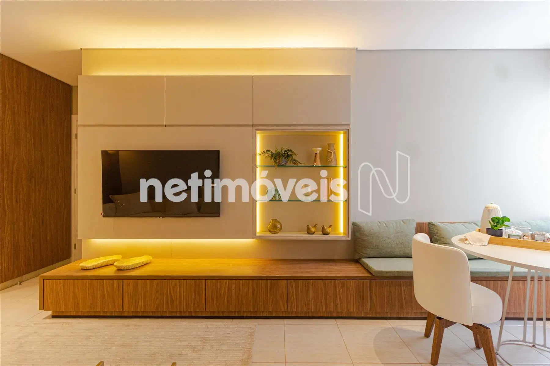 * Sala para 02 ambientes com piso em porcelanato, sofá, mesa, 02 cadeiras, frigobar, tapete, cortina, painel e TV;