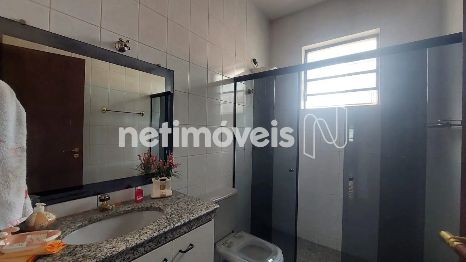 Banheiro Social com box em vidro temperado; piso e bancada do lavatório em granito. Armário sob lavatório.