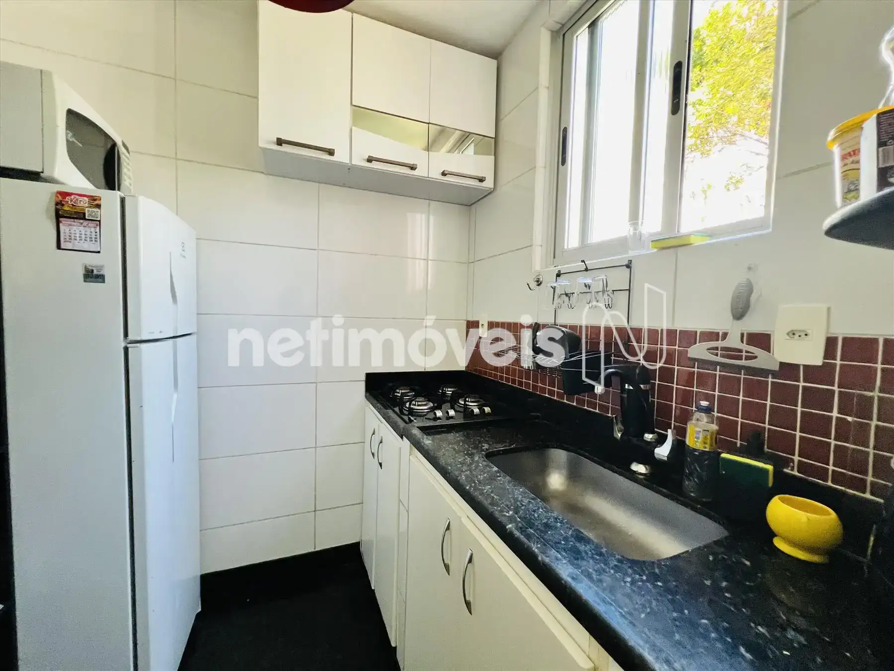 - Cozinha com armários, piso em granito e paredes azulejadas até o teto;