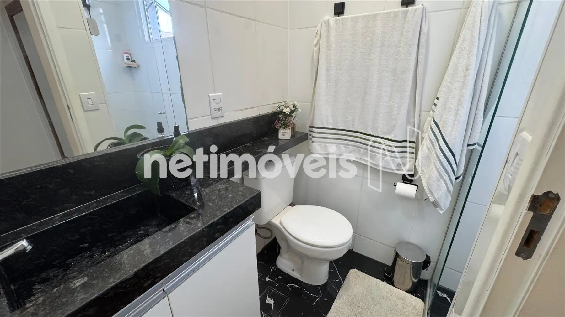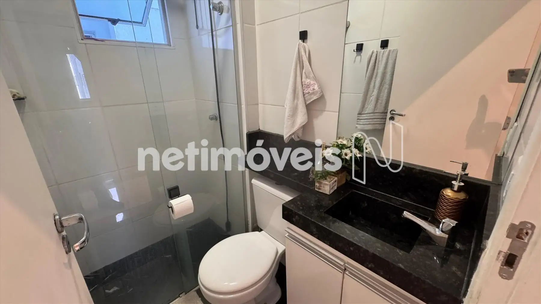 Banhos (Suíte e Social ) piso em porcelanato, bancada em granito, armário, box em blindex,
