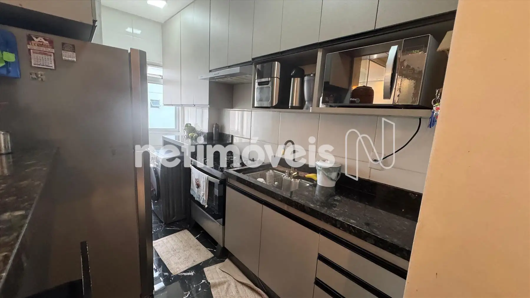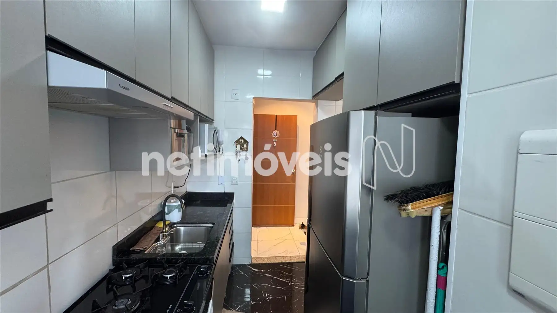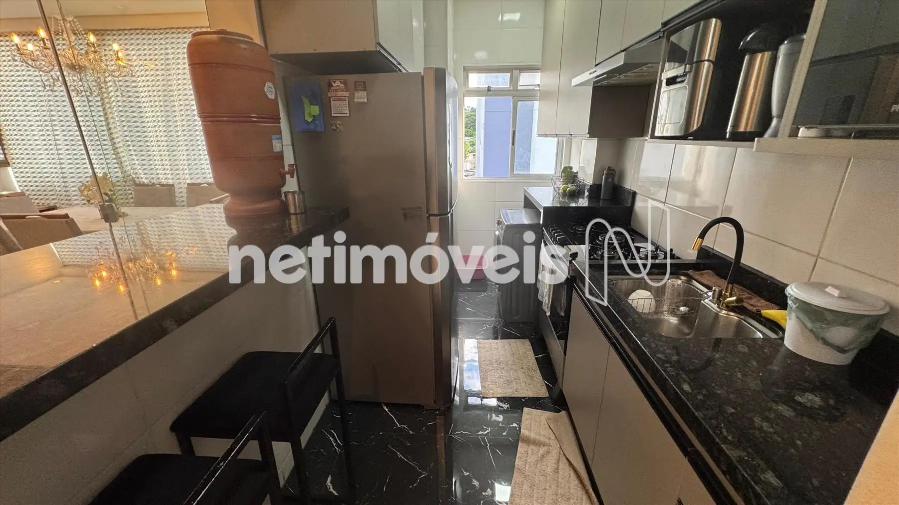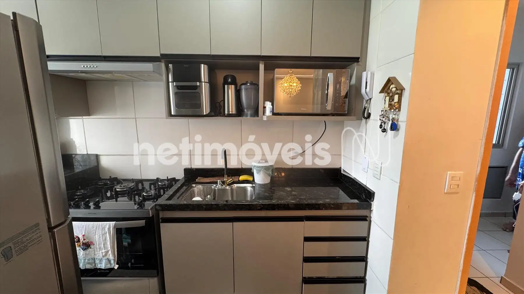 Cozinha em estilo americano, piso em porcelanato, bancada em granito com armarios,