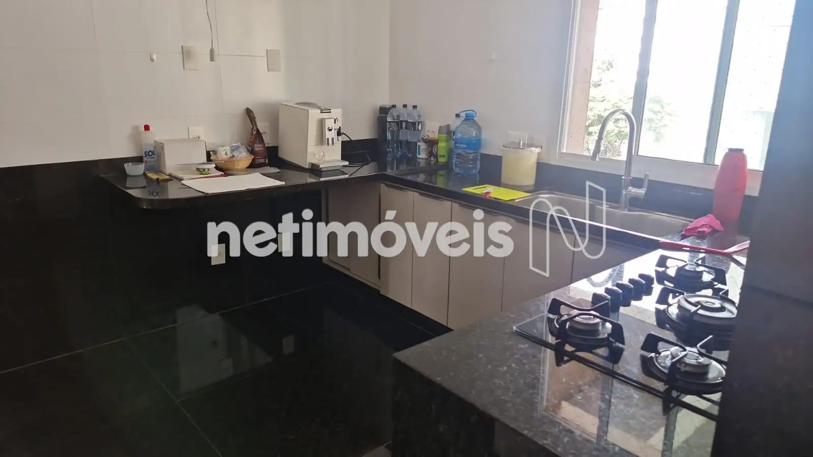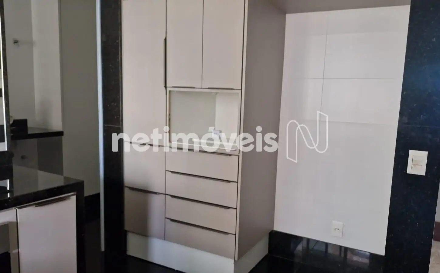 Cozinha com armários, piso e bancada em granito.