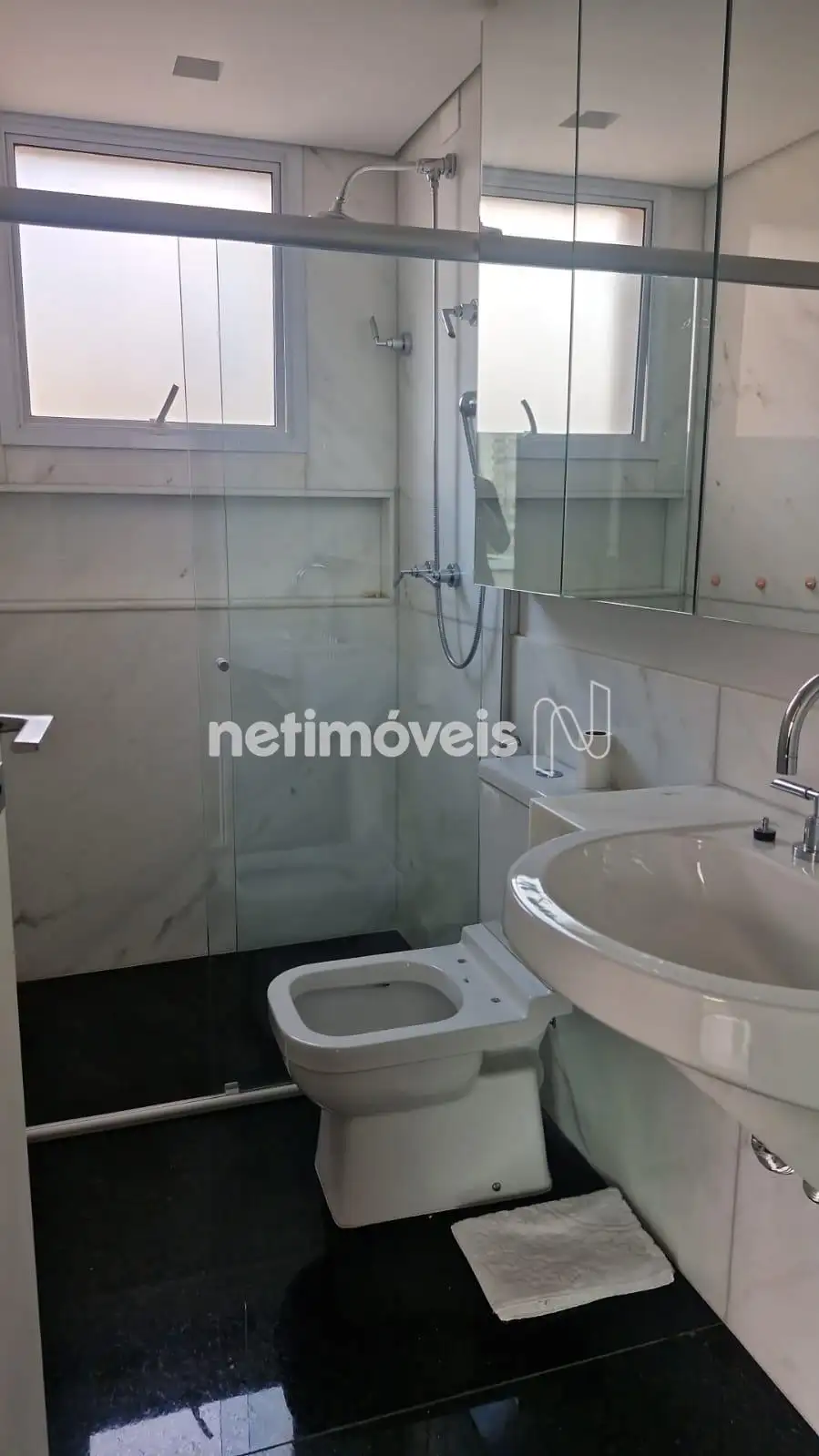 Banho suíte com armários, box blindex, piso e bancada em marmore