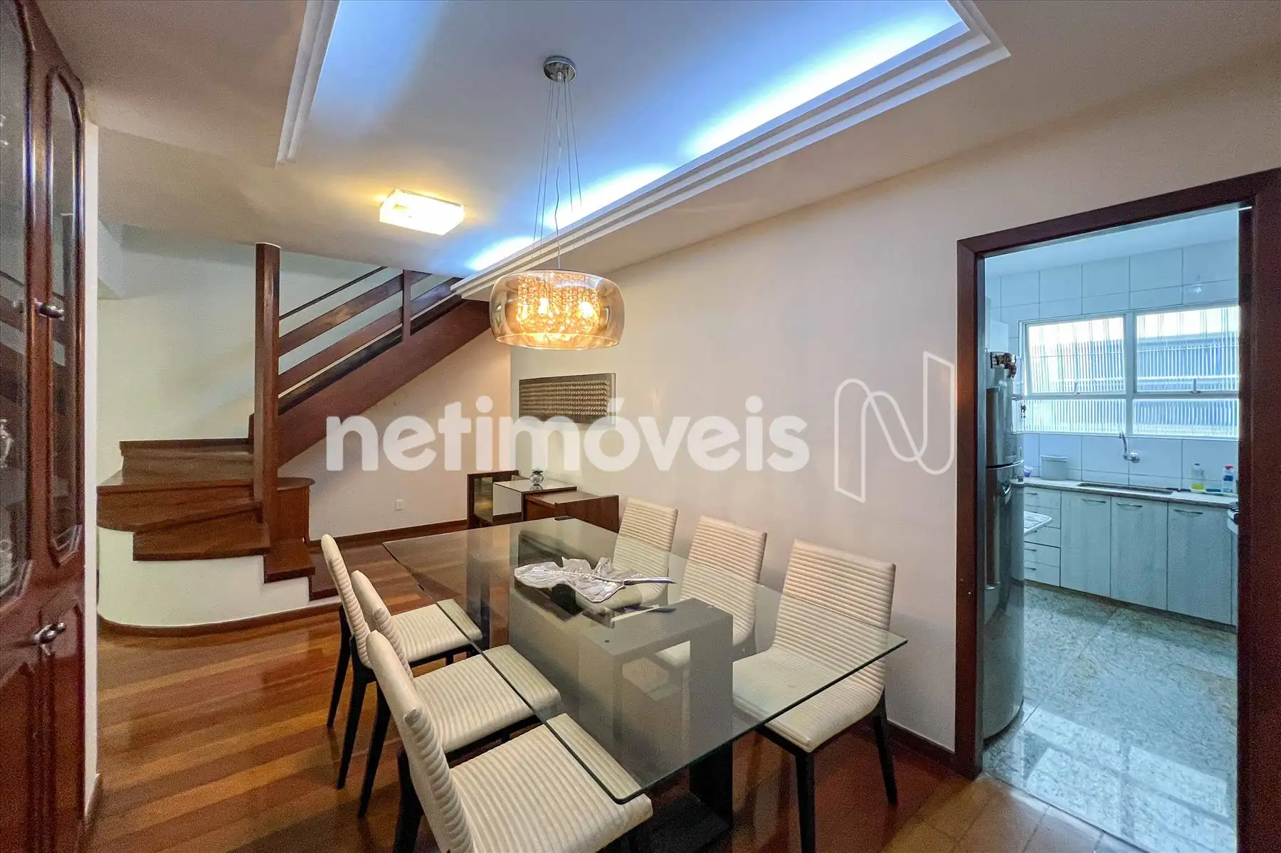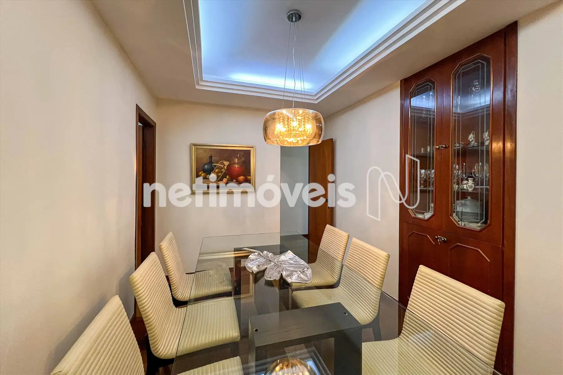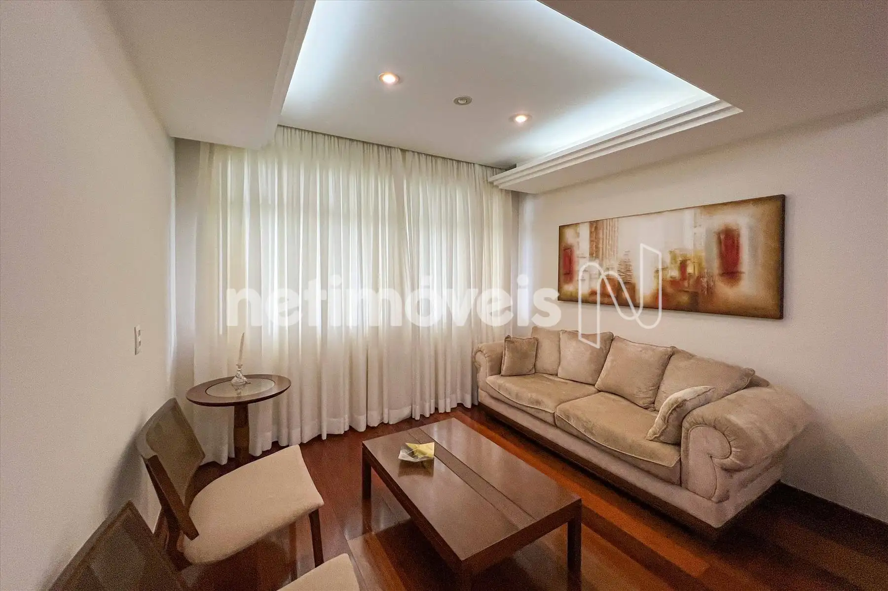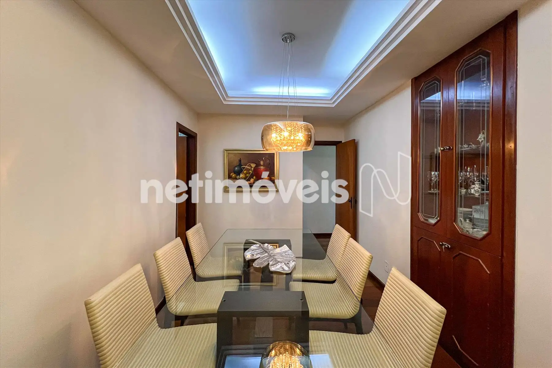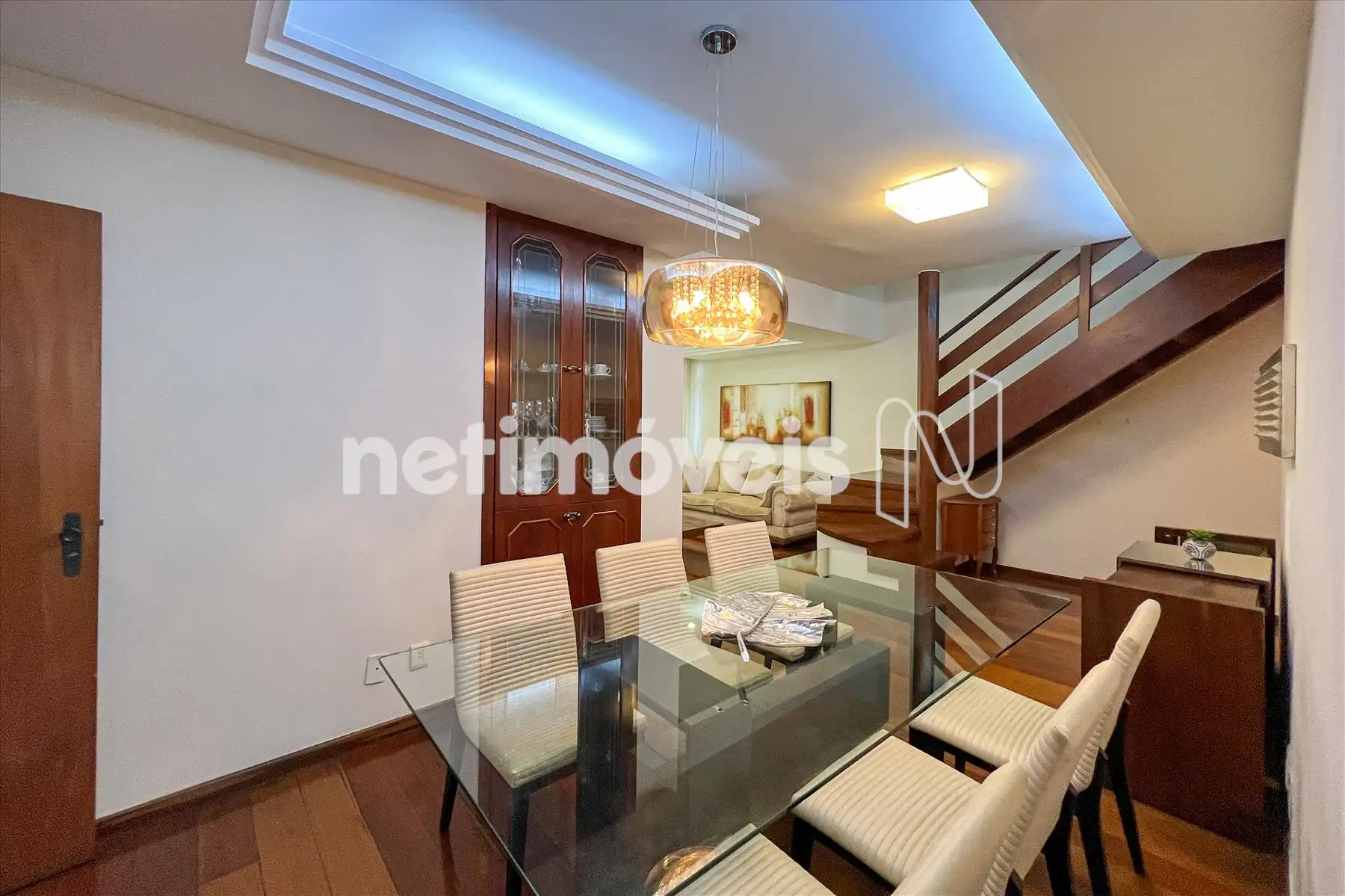 Sala ampla em L para 02 ambientes, estar e jantar, piso em tábua corrida, teto rebaixado com projeto luminotécnico. Espaço de Cristaleira.