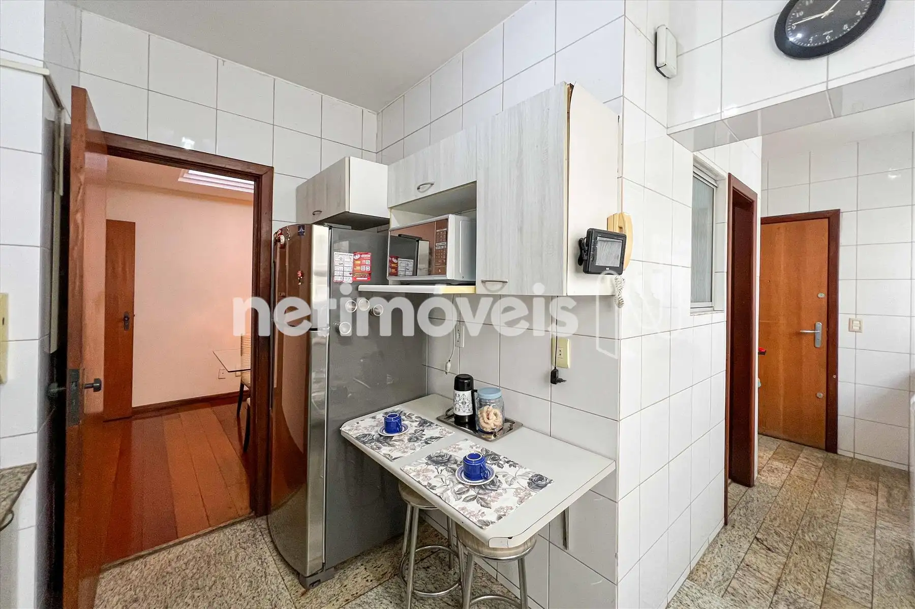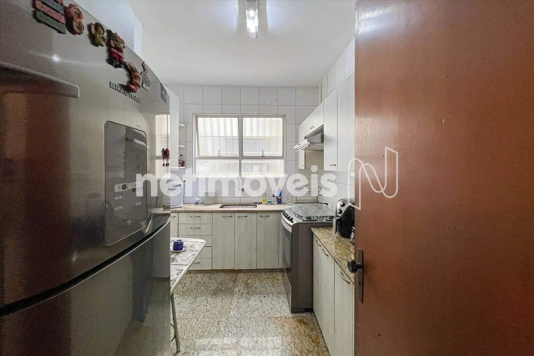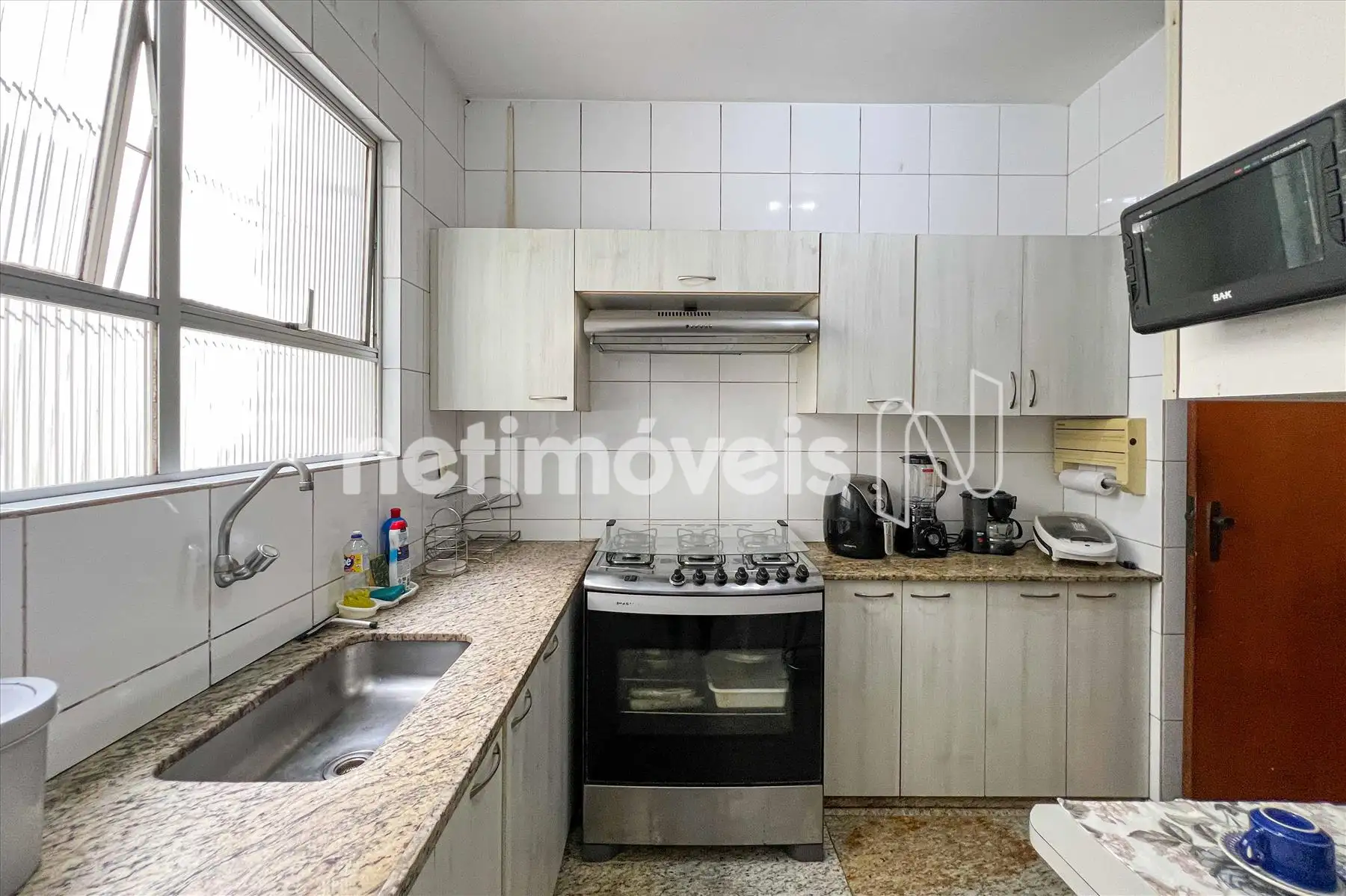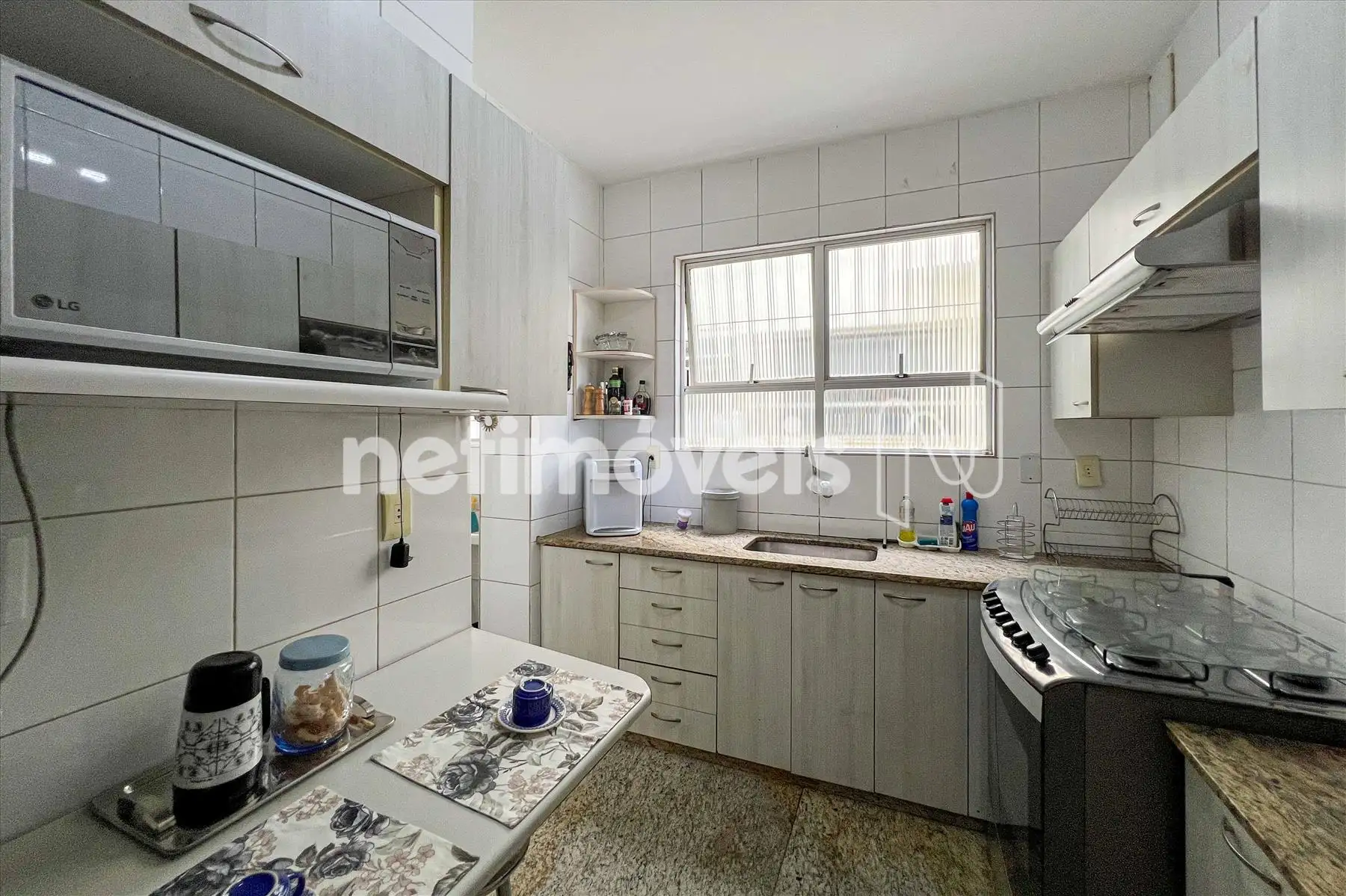 Cozinha com piso e bancada em granito, armários sob e sobre as bancadas.