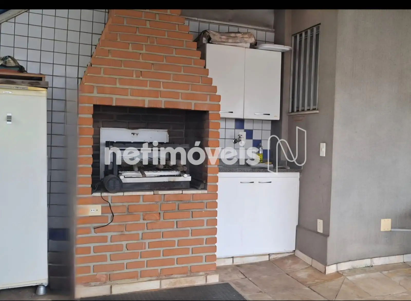 Espaço gourmet coberto, possui churrasqueira, bancada em granito, armários.