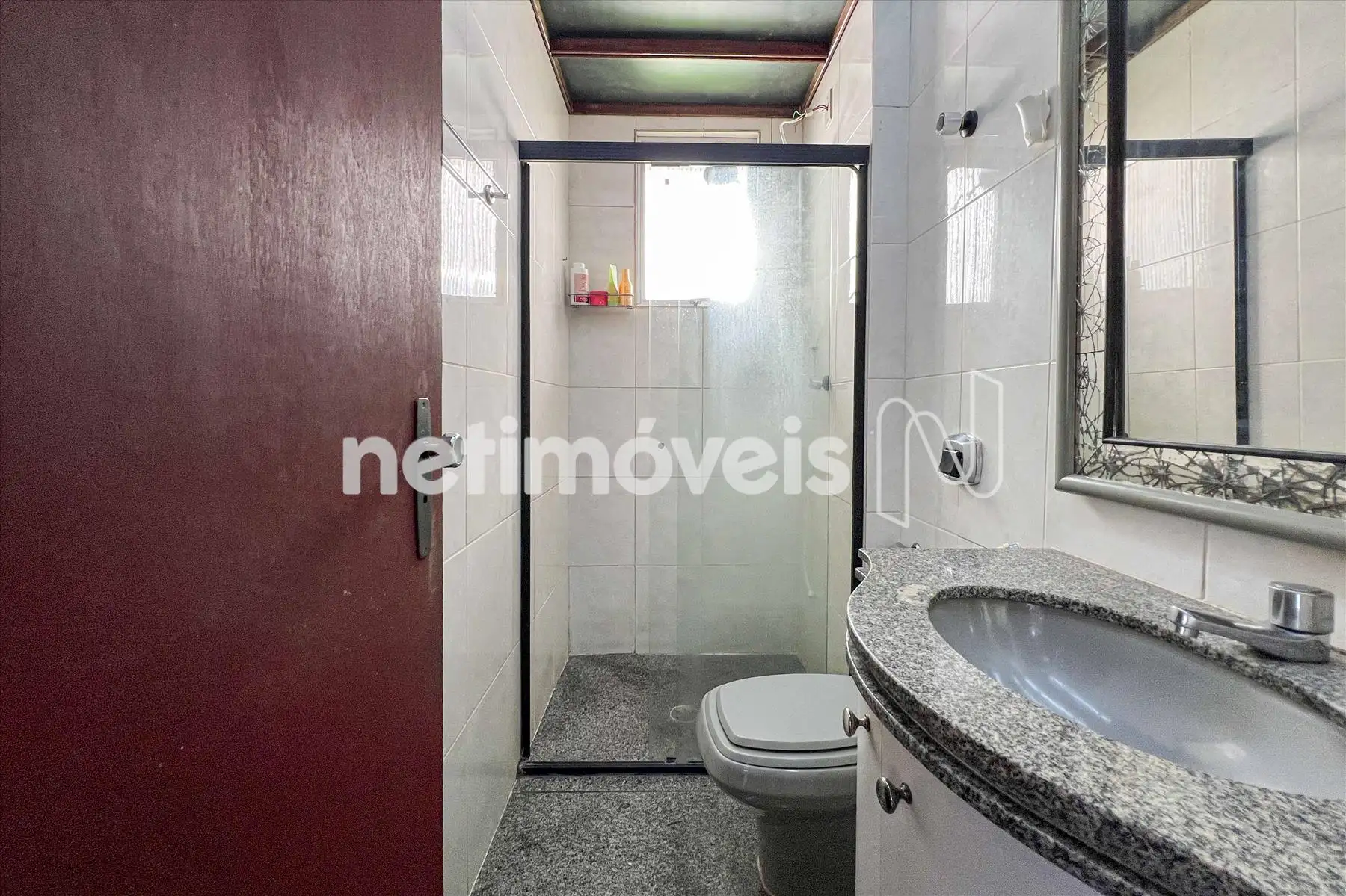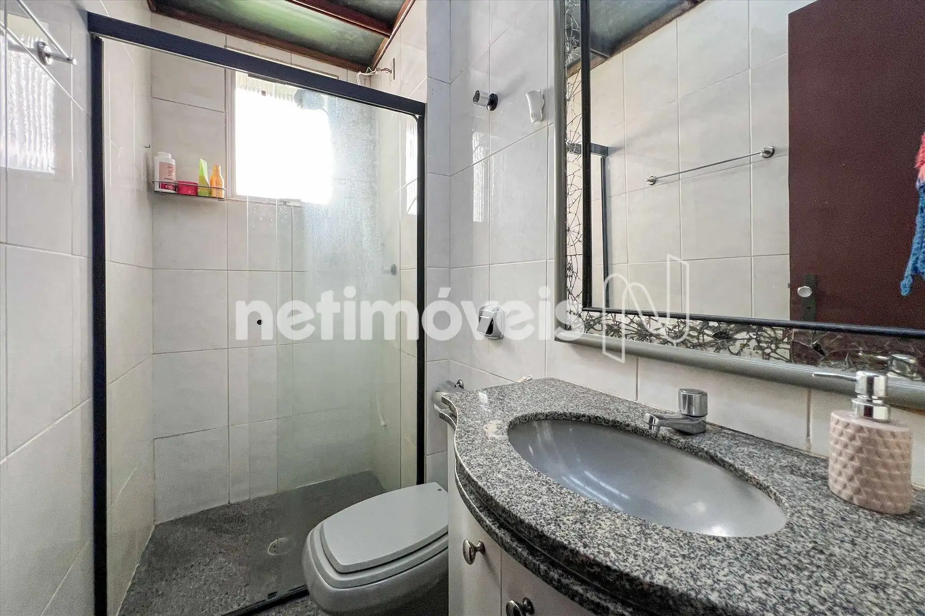 Banheiro social com piso e bancada em granito, armários, Box em vidro temperado, chuveiro elétrico.