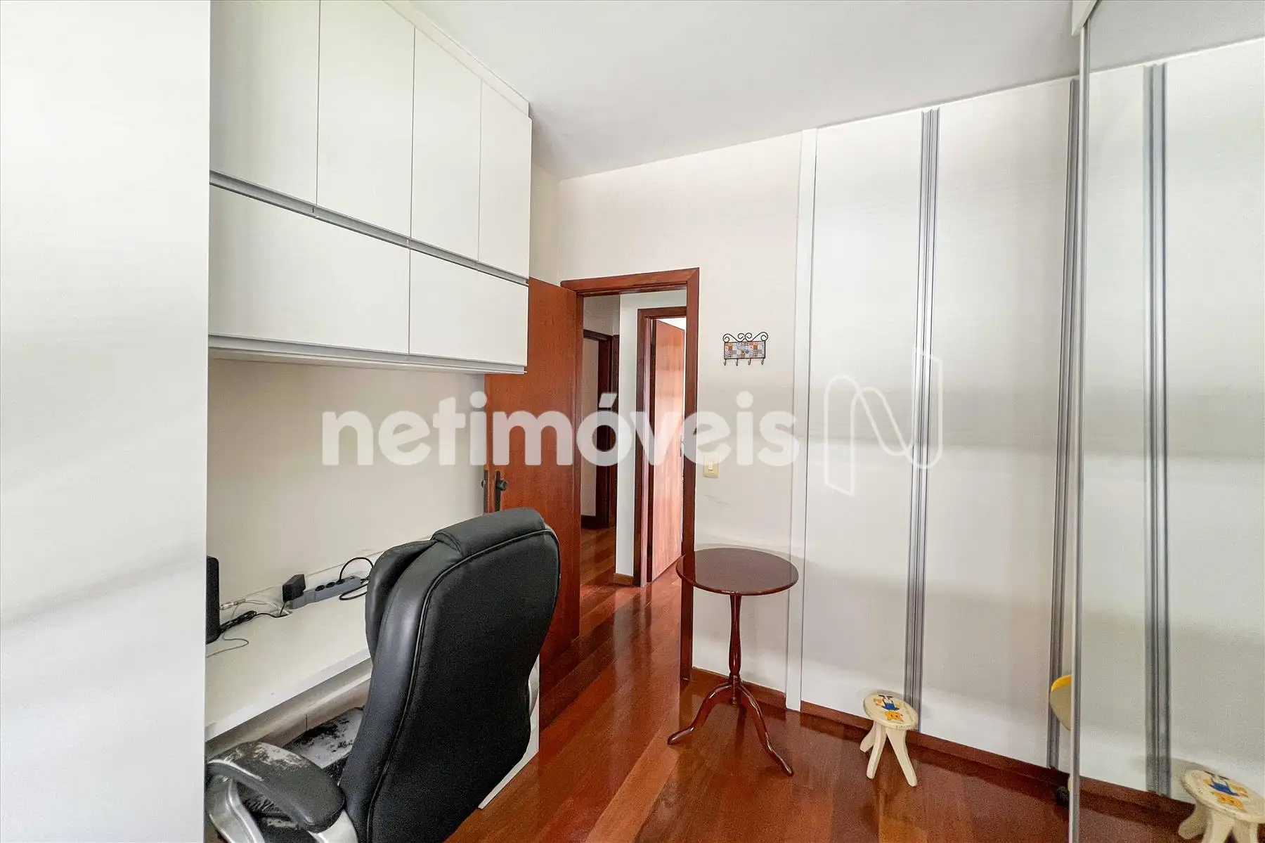 Um dos quartos feito como escritório com armários e bancada.
