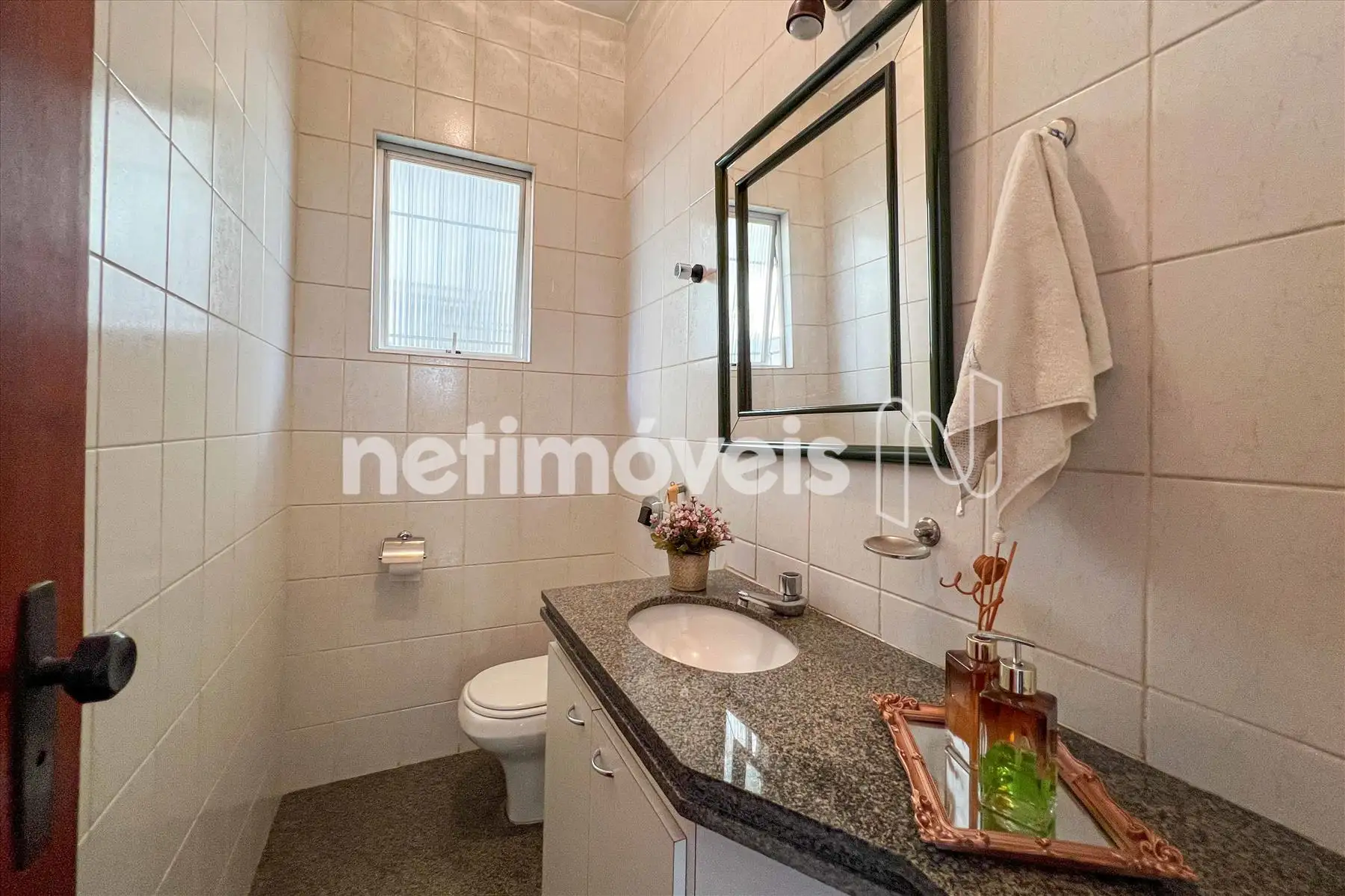 Lavabo com piso e pia em granito, armário.