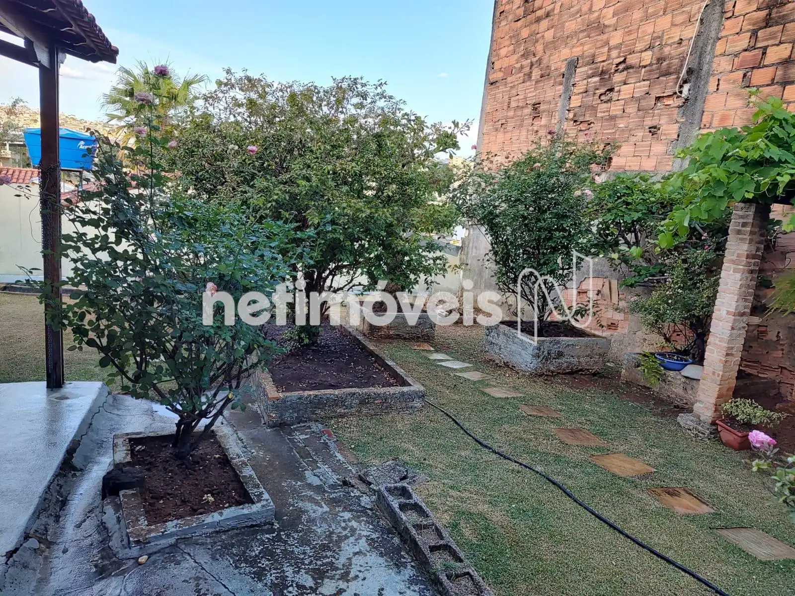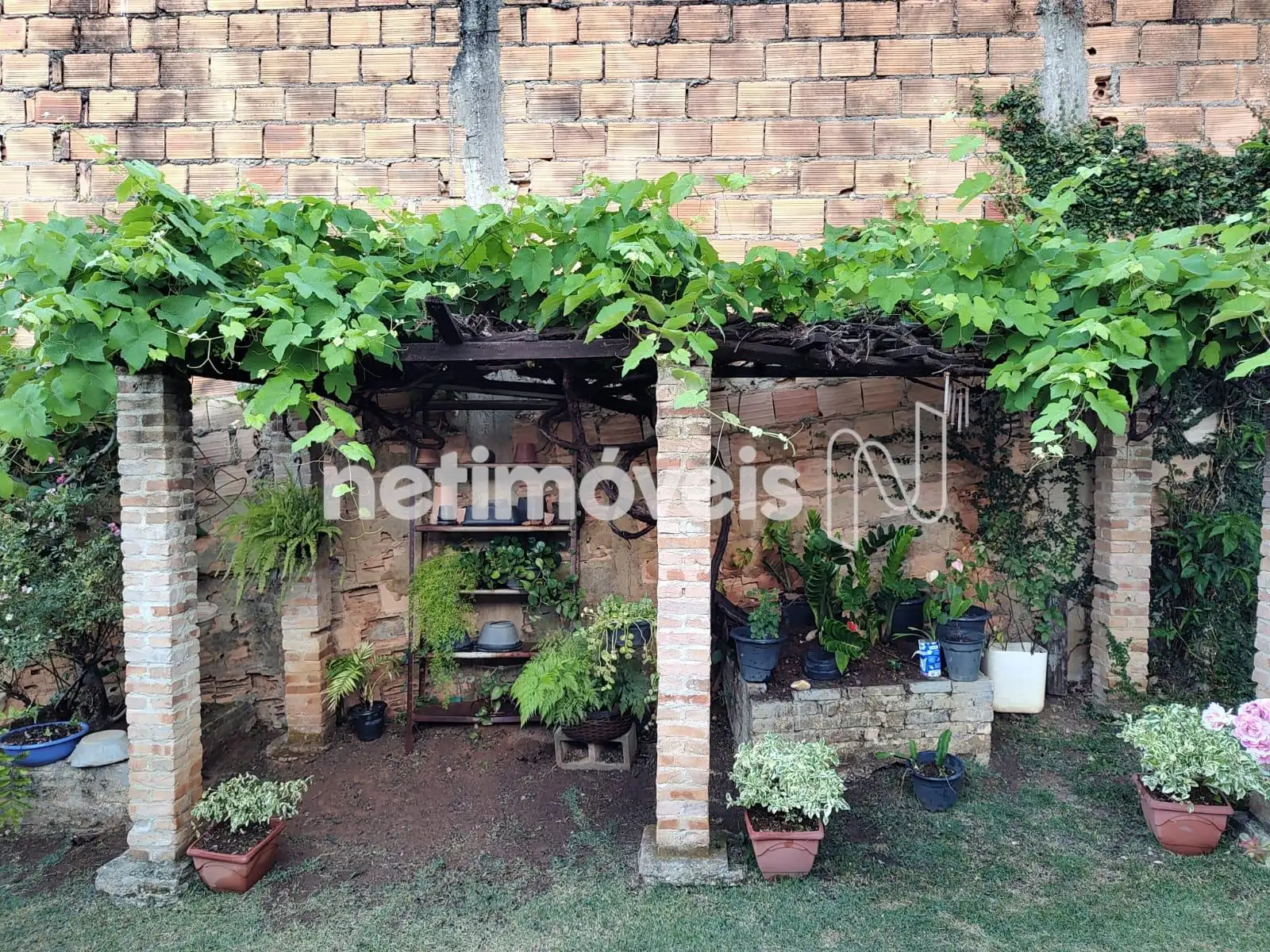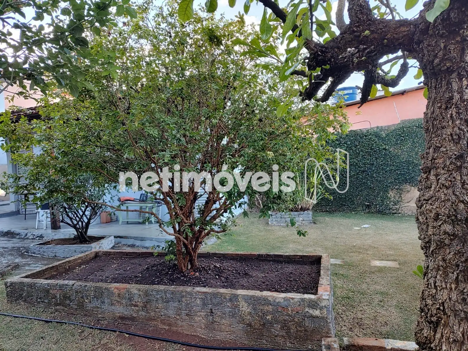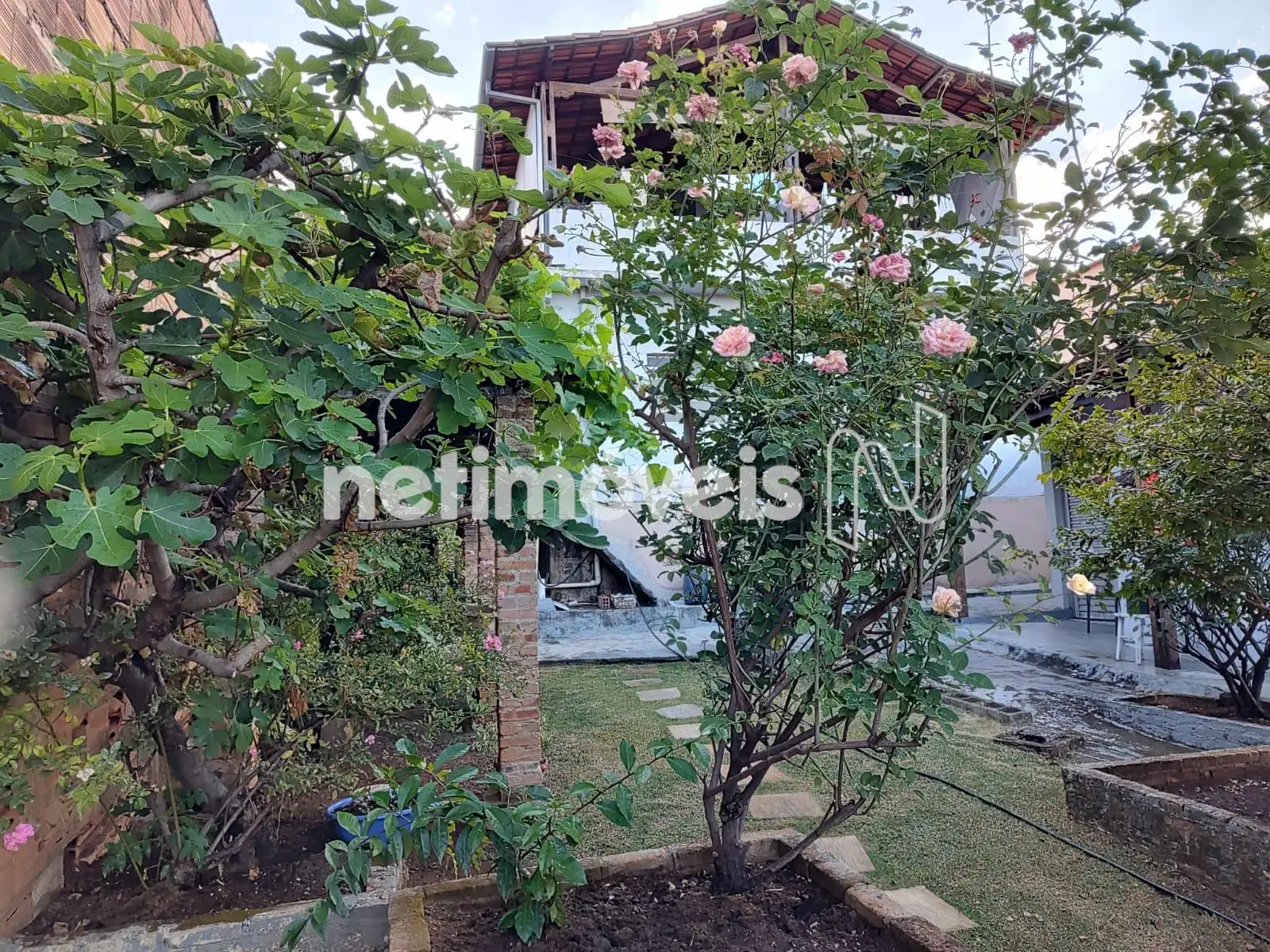 Árvores frutíferas, piso gramado, plantas ornamentais.
