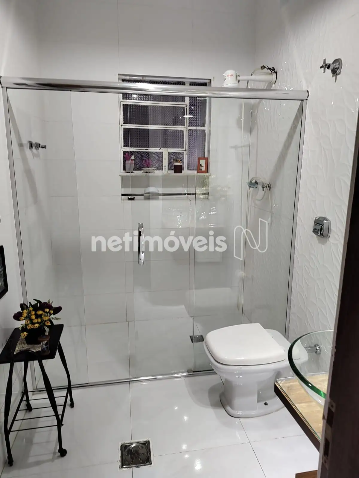 Banho social com box de vidro temperado.
