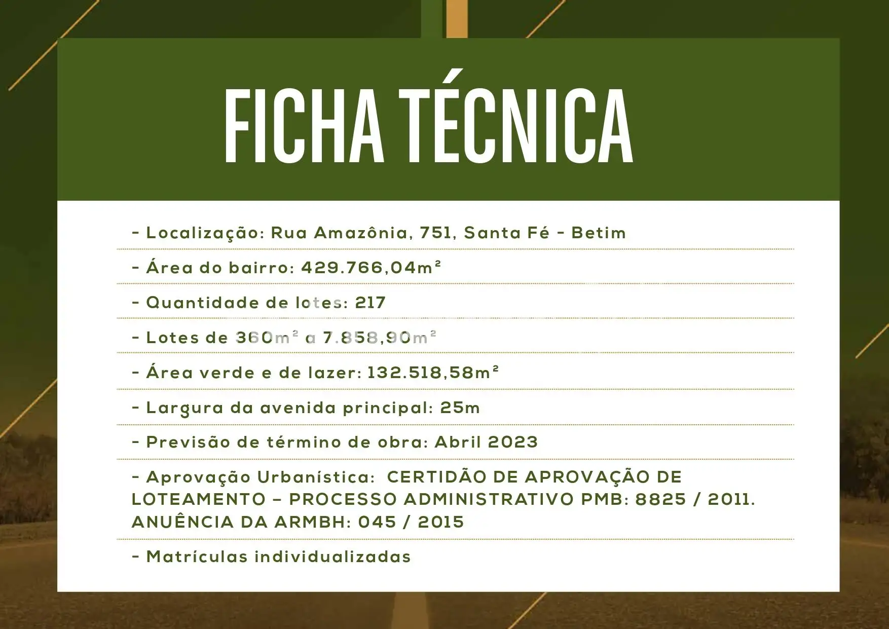 LOCALIZADO EM BETIM, A 05 MINUTOS DO CENTRO E 800M DA PUC. BETIM. AVENIDA PRINCIPAL DE ACESSO A PARTIR DO BAIRRO SANTA FÉ COM 25M DE LARGURA.