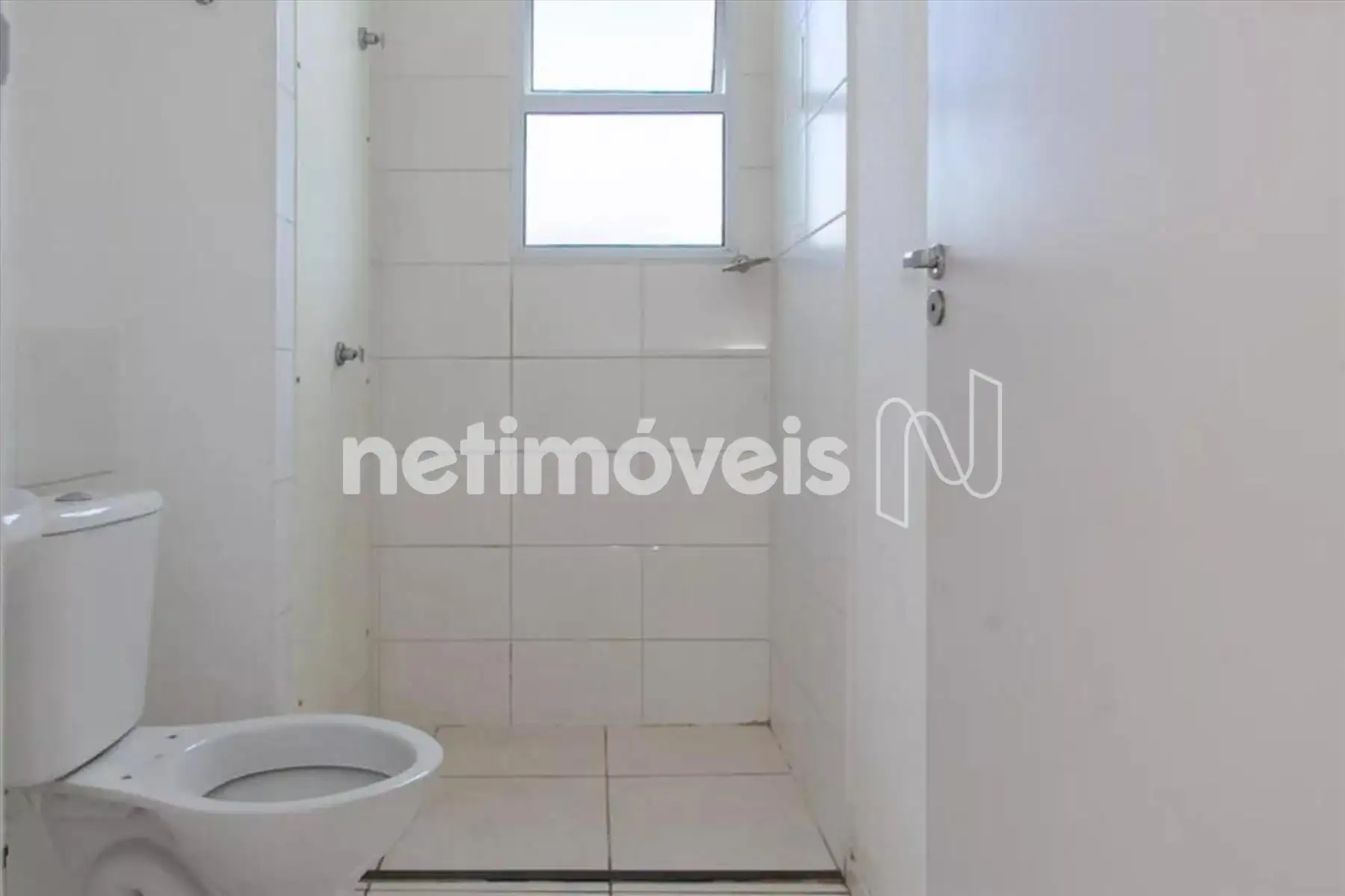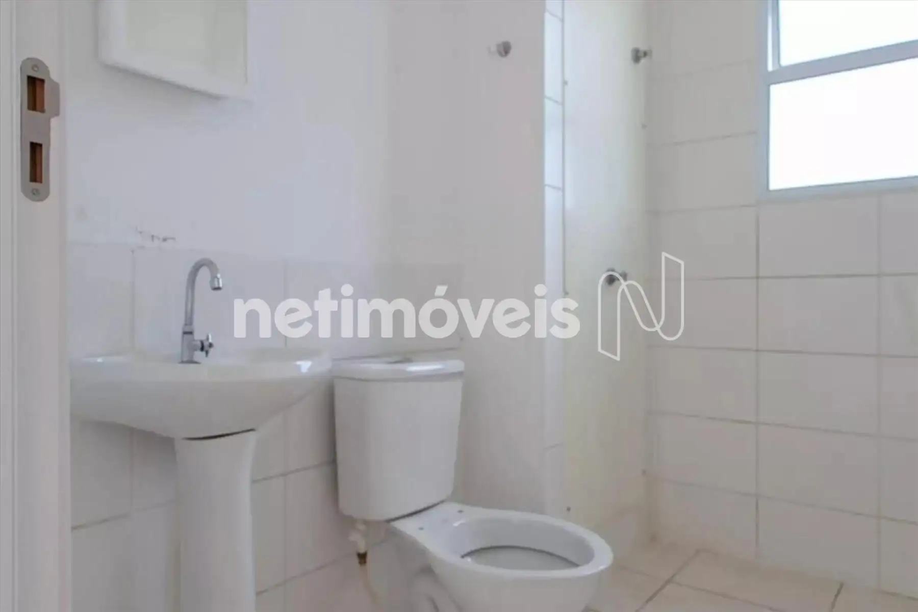 Banheiro social todo revestido em cerâmica.
