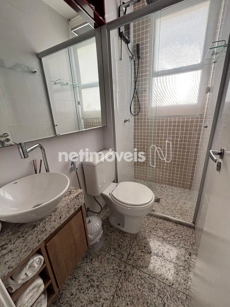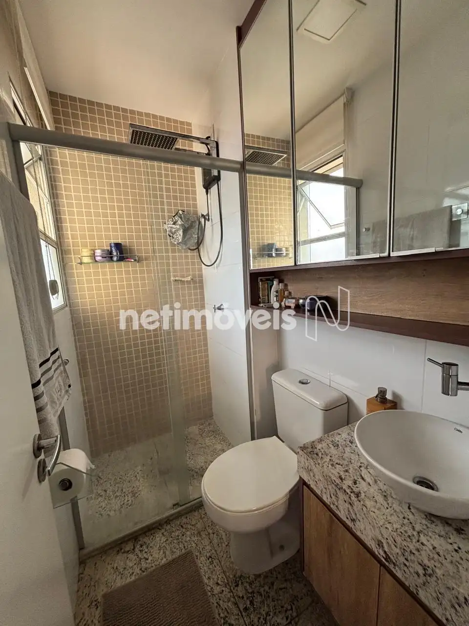 Banheiro com box e armário.