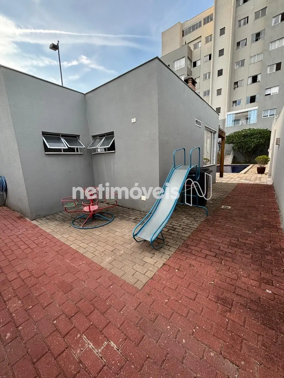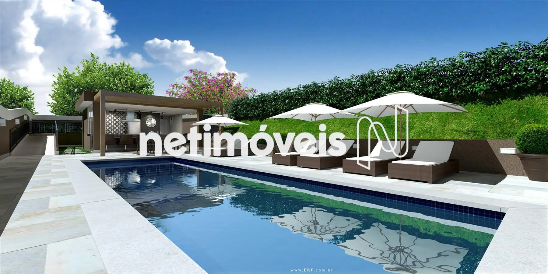 Área de lazer com piscina, salão de festas, playground e área verde.