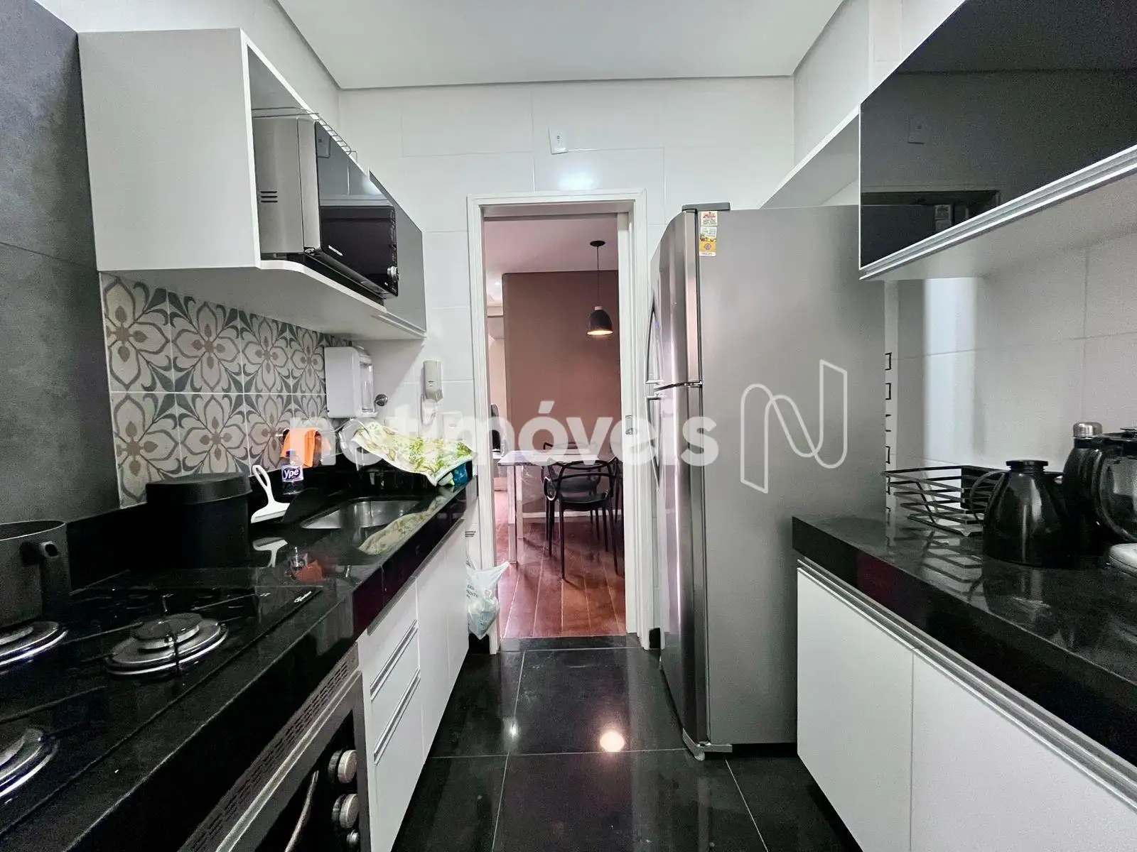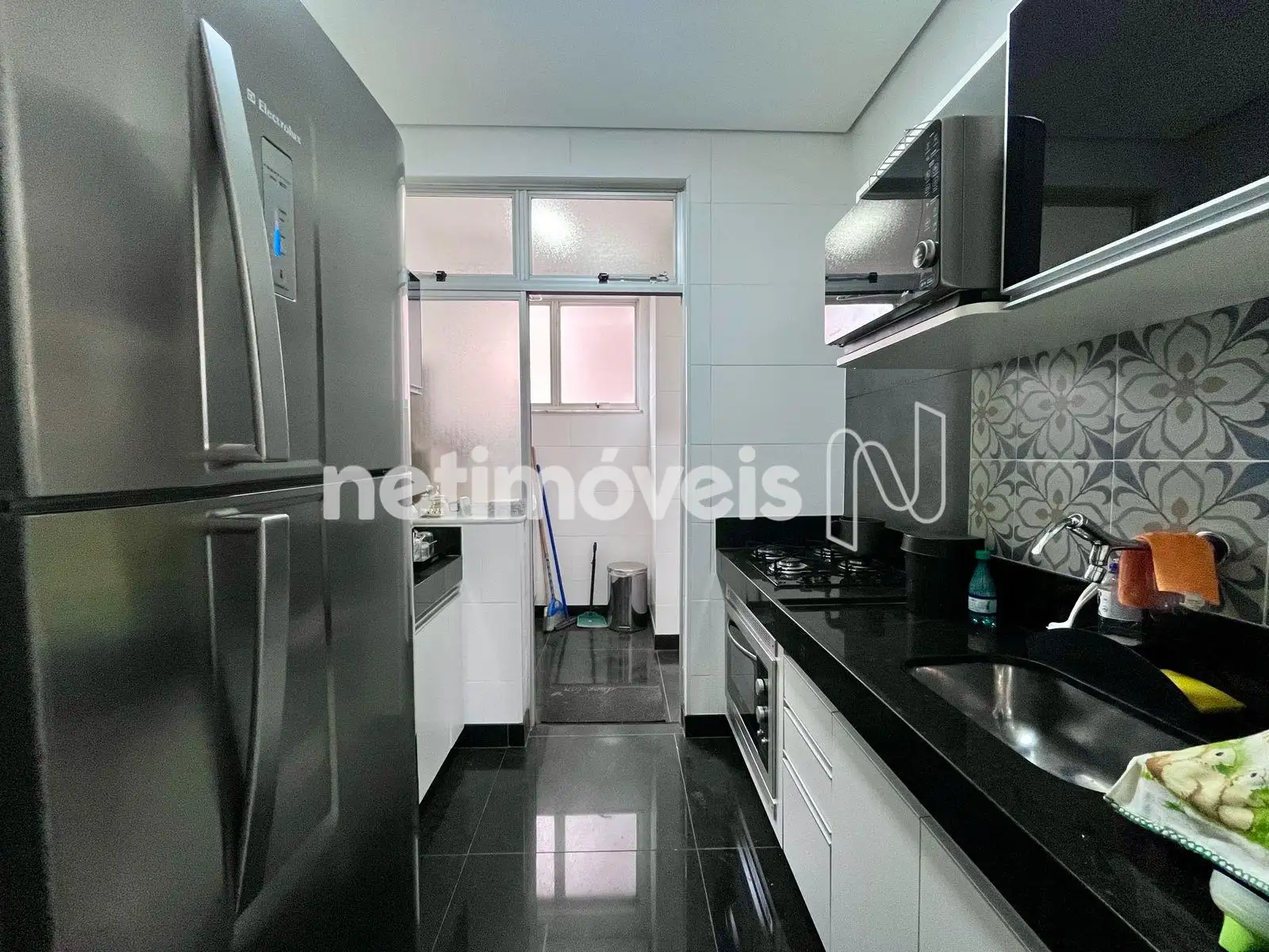 Cozinha com piso e bancada em granito, com armários, área de serviço e DCE;
