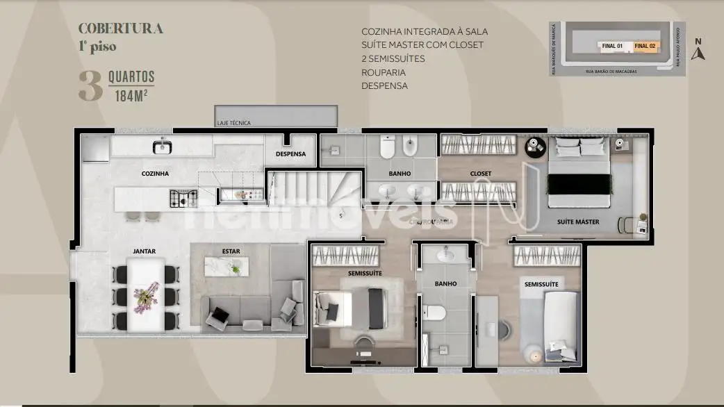 Cozinha integrada à sala, lavabo, suíte máster c/ closet, 2 semis-suítes, rouparia, área de serviço.