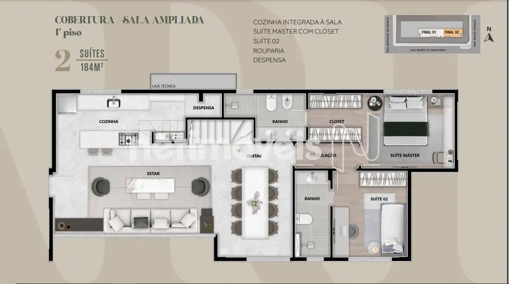 Cozinha/sala, lavabo, suíte máster c/ closet, 2 semis-suítes, rouparia, área de serviço.