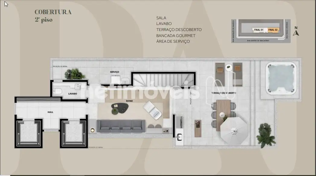 2º PISO: Sala, lavabo, terraço descoberto, bancada gourmet, área de serviço.