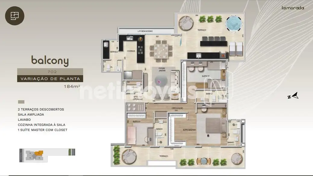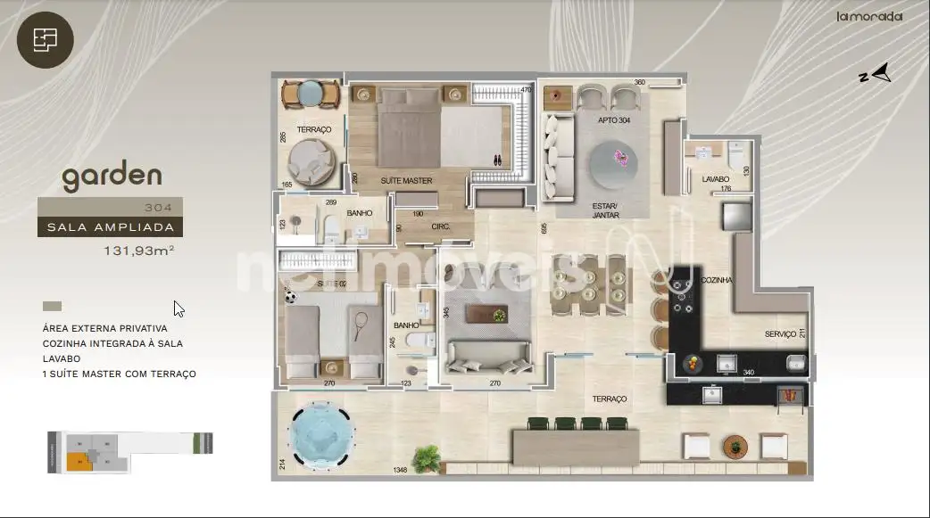 ÁREA EXTERNA PRIVATIVA COZINHA INTEGRADA À SALA LAVABO 1 SUÍTE MASTER COM TERRAÇO.