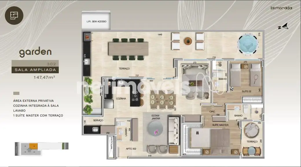 COZINHA INTEGRADA À SALA LAVABO 1 SUÍTE MASTER 2 SEMI-SUÍTES