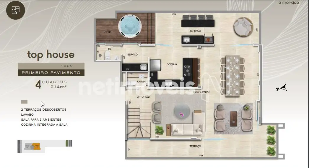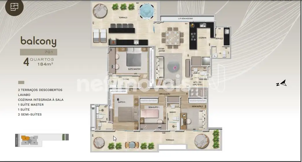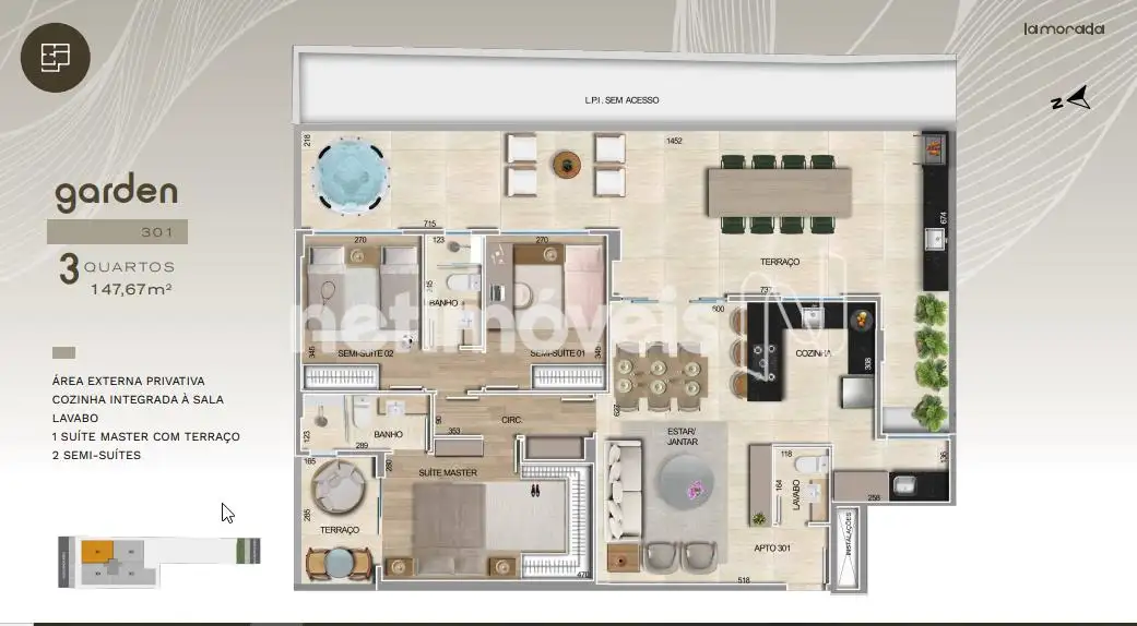 COZINHA INTEGRADA À SALA LAVABO 1 SUÍTE MASTER 2 SEMI-SUÍTES