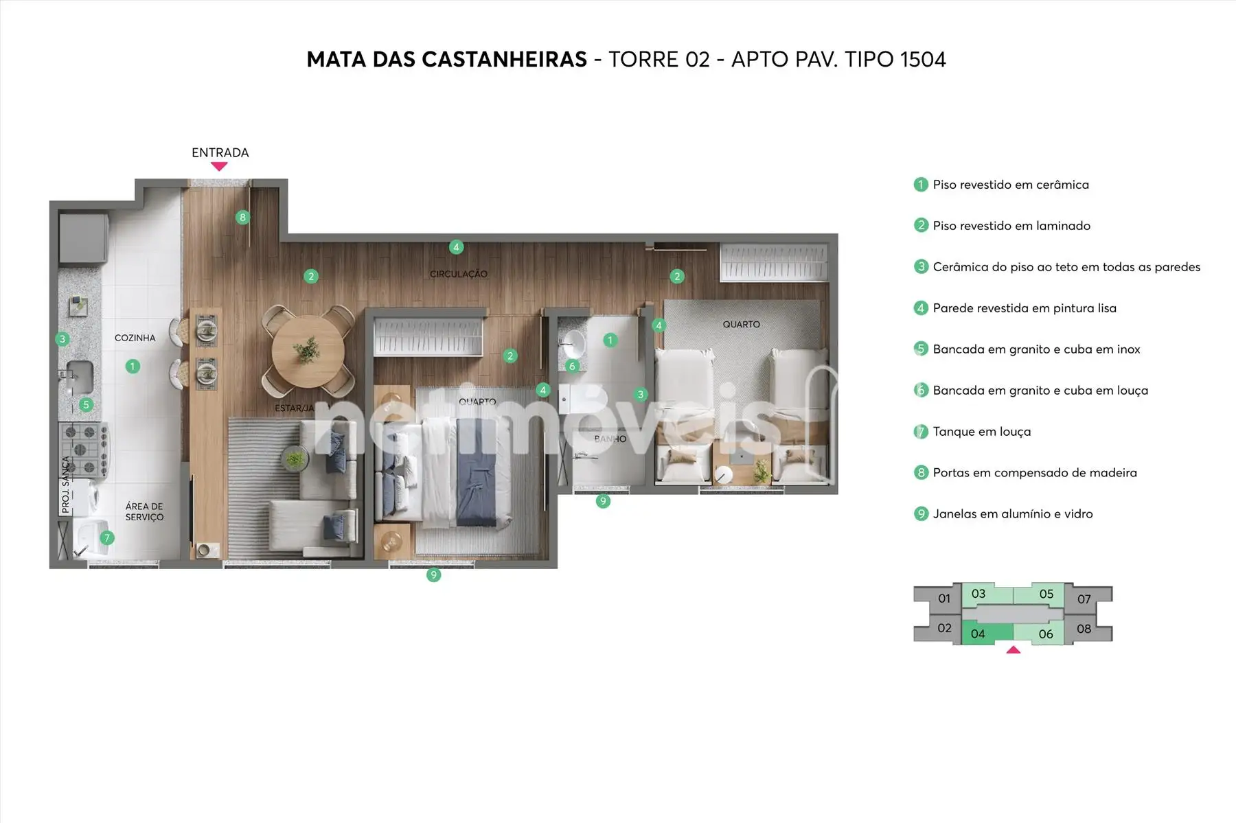 Pisos: laminado e porcelanato.