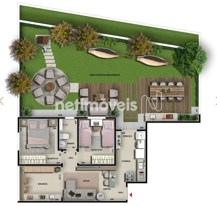 2 Espaço Gourmet; Espaço churrasqueiro; Brinquedoteca; Espaço Fitness coberto; Playground descoberto; Pomar; Espaço Pet; Mini Quadra descoberta; Espaço Piquenique; Espaço Redes.