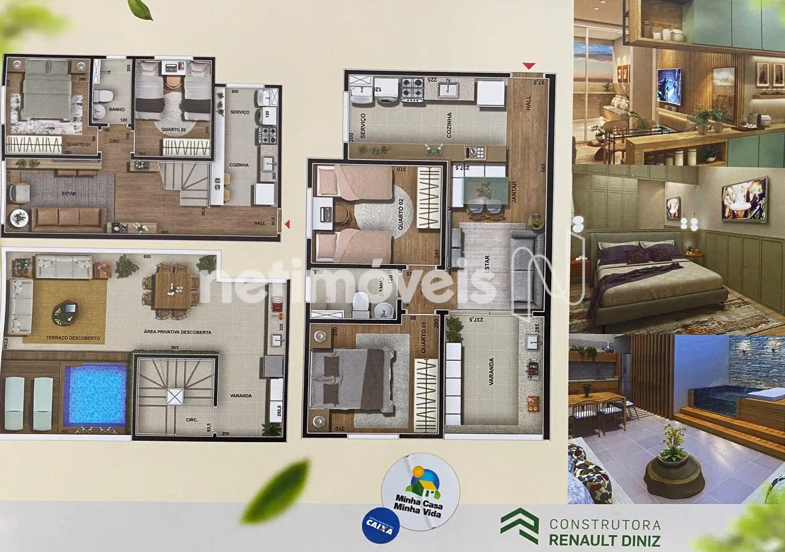 Piso laminado na sala e quartos, pias em granito na cozinha e banheiro. Revestimento de cerâmica até o teto na cozinha, banheiro e área de serviço.