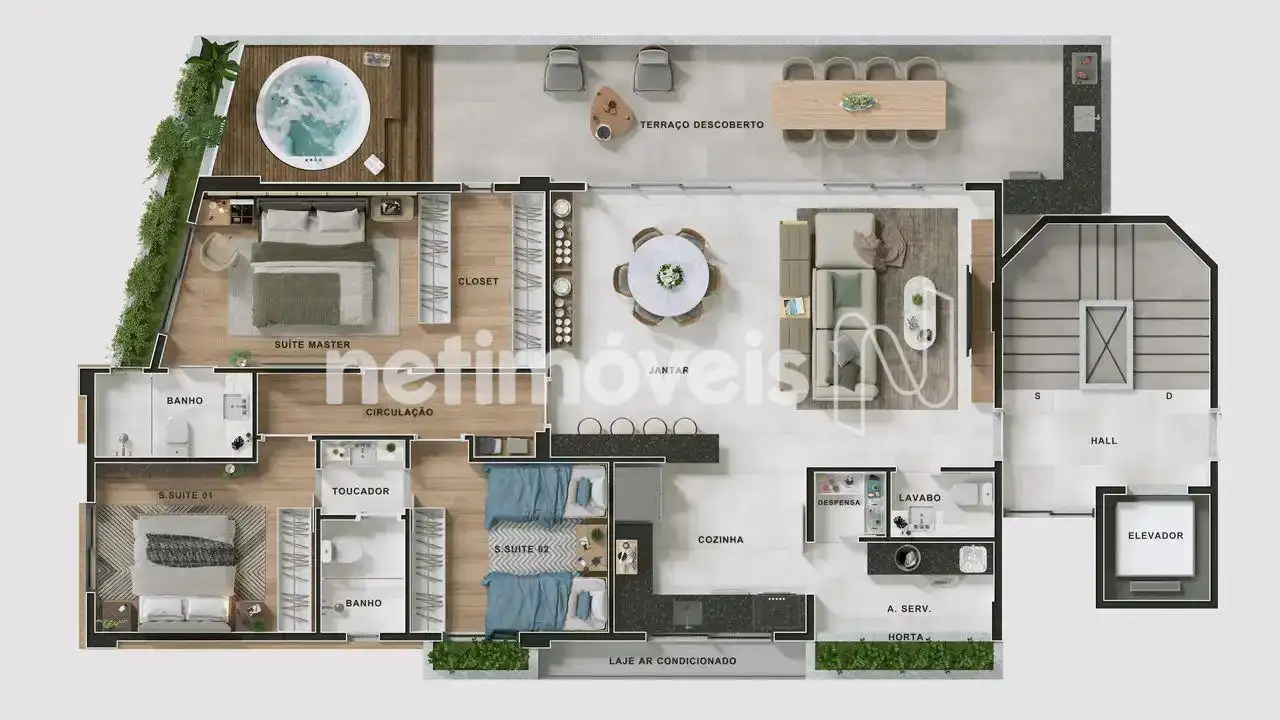 A área privativa possui 147 m², com acabamento de alto padrão e um projeto que privilegia o bem-estar e a funcionalidade. São 03 quartos, sendo 01 suíte, além de 03 banheiros ao todo e um lavabo.