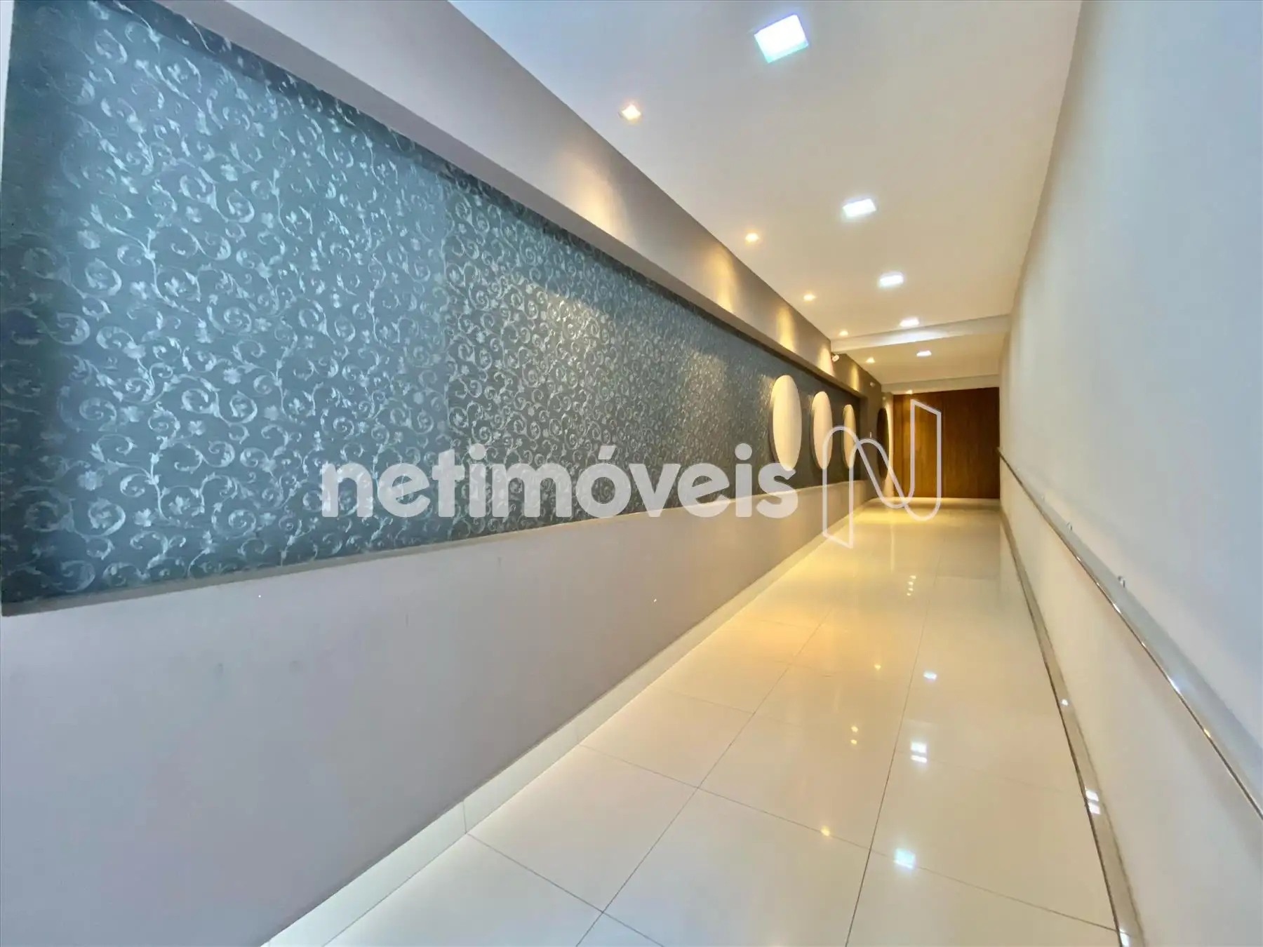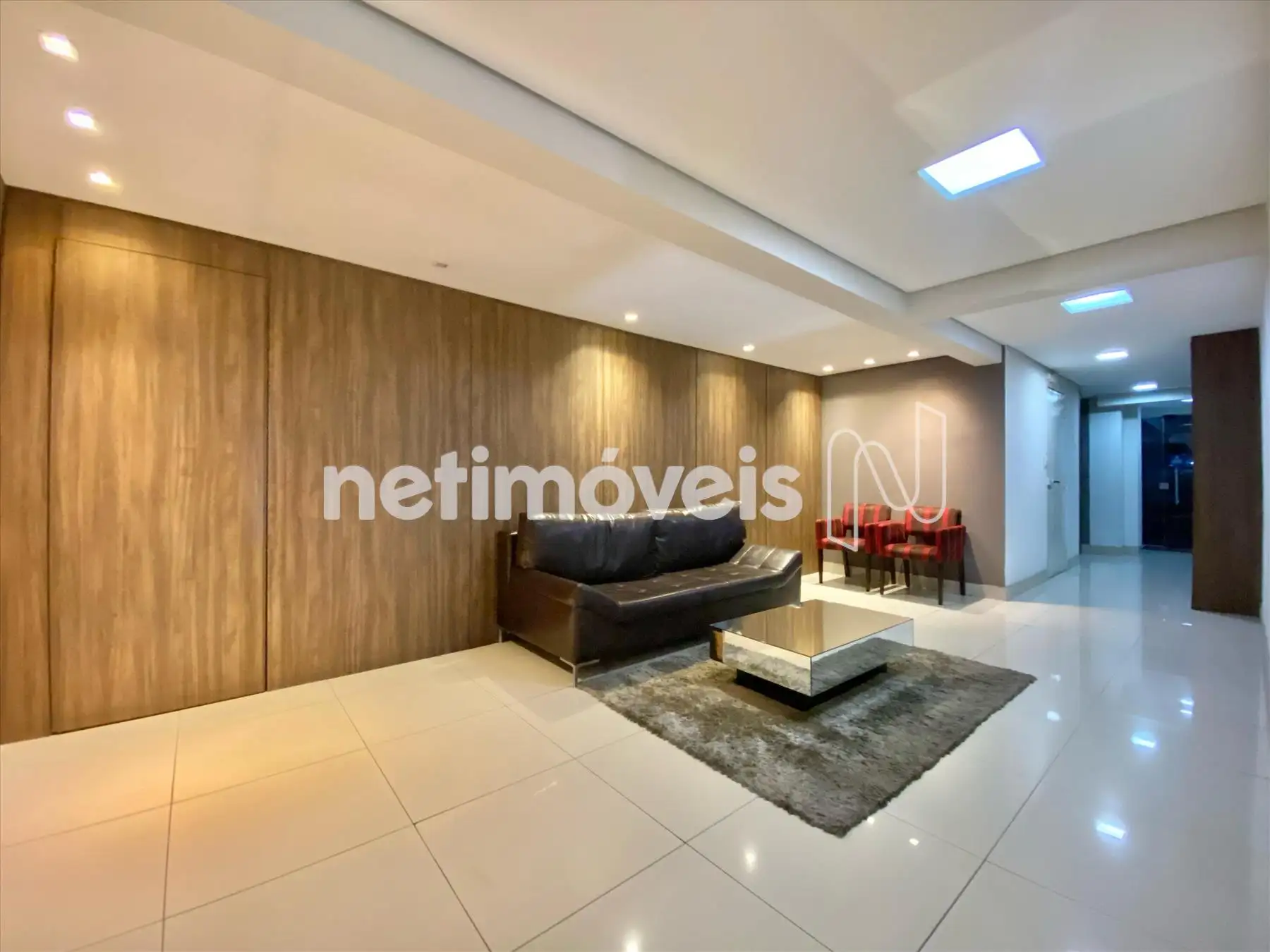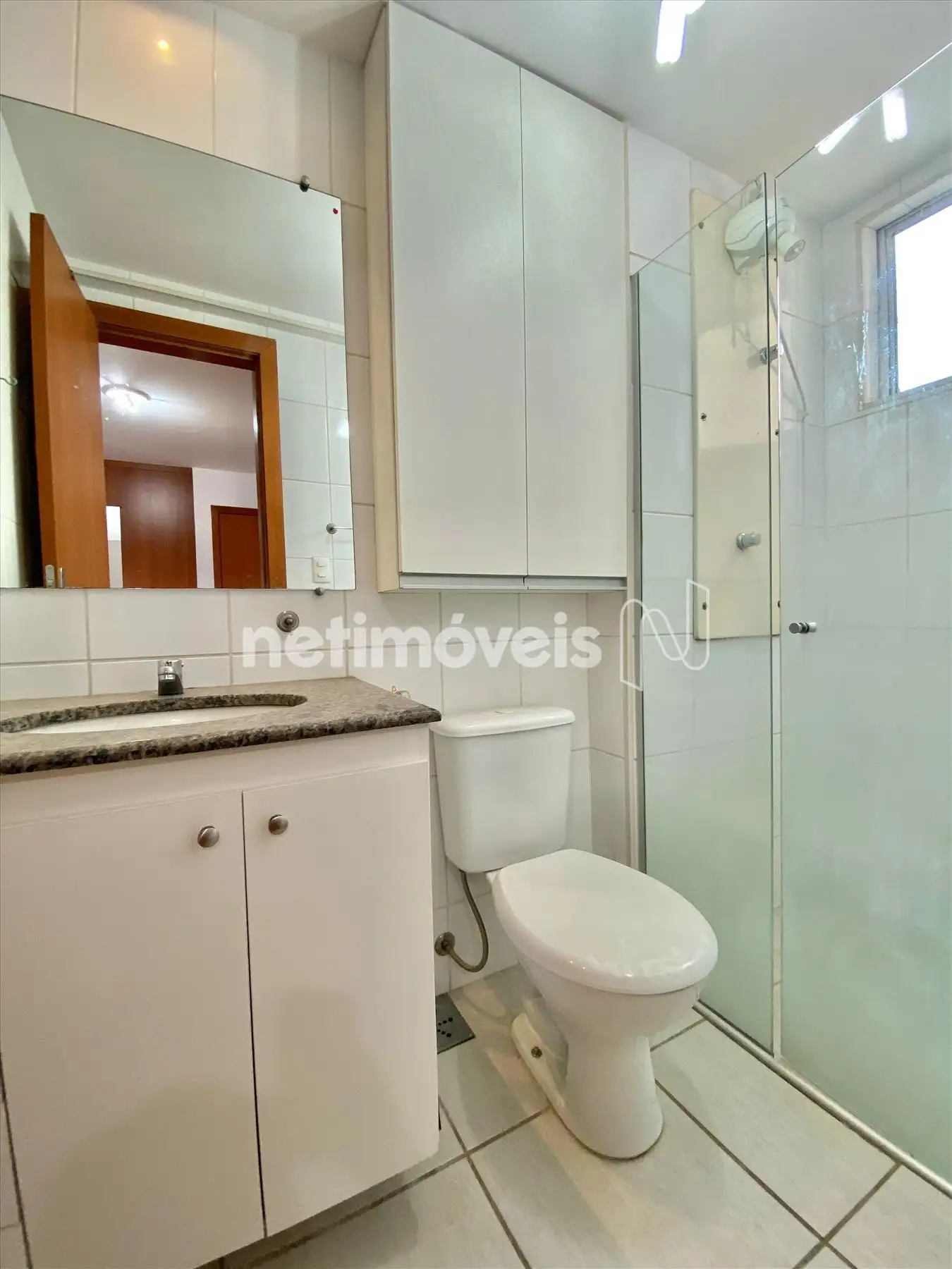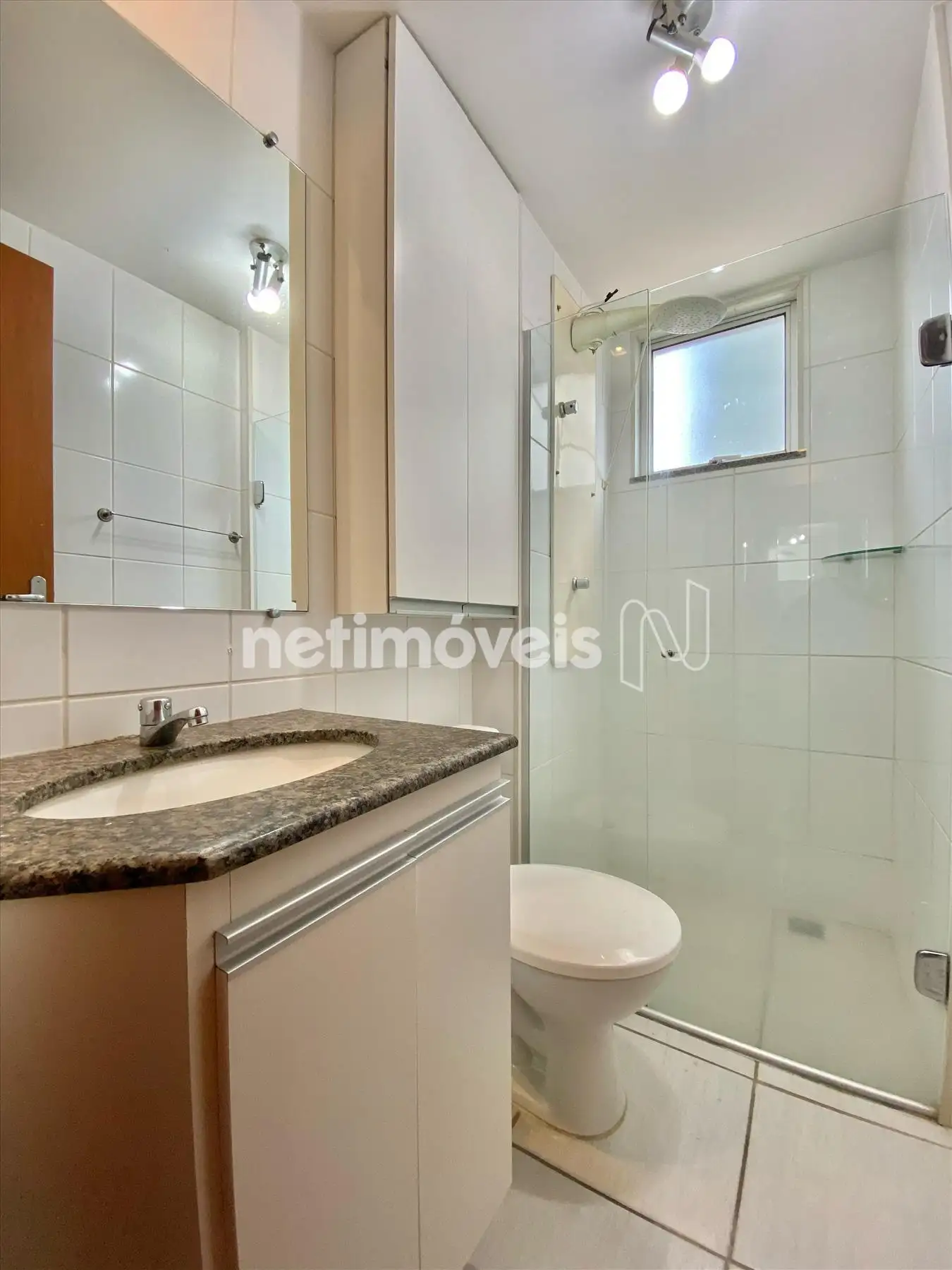 - 01 banheiro social com espelho, armários e box de vidro;