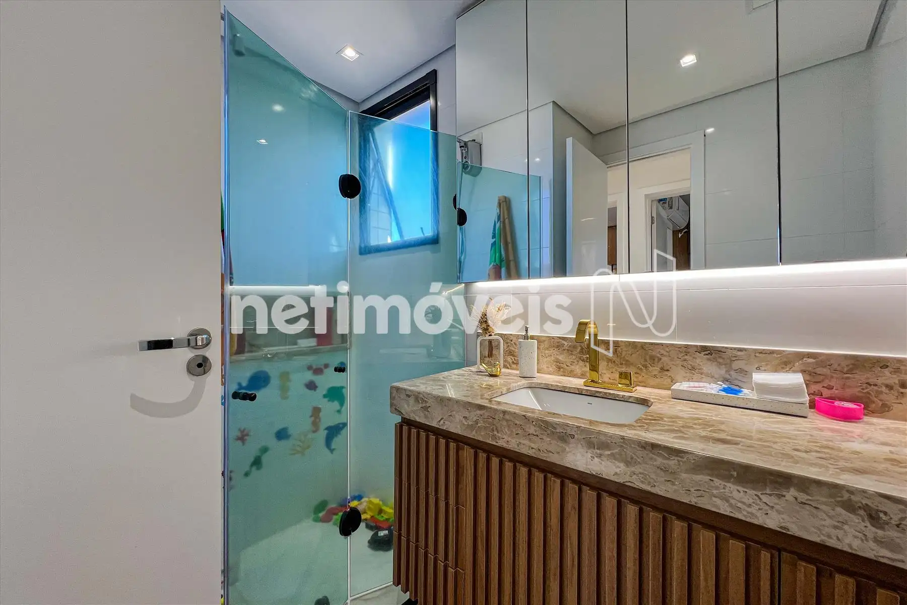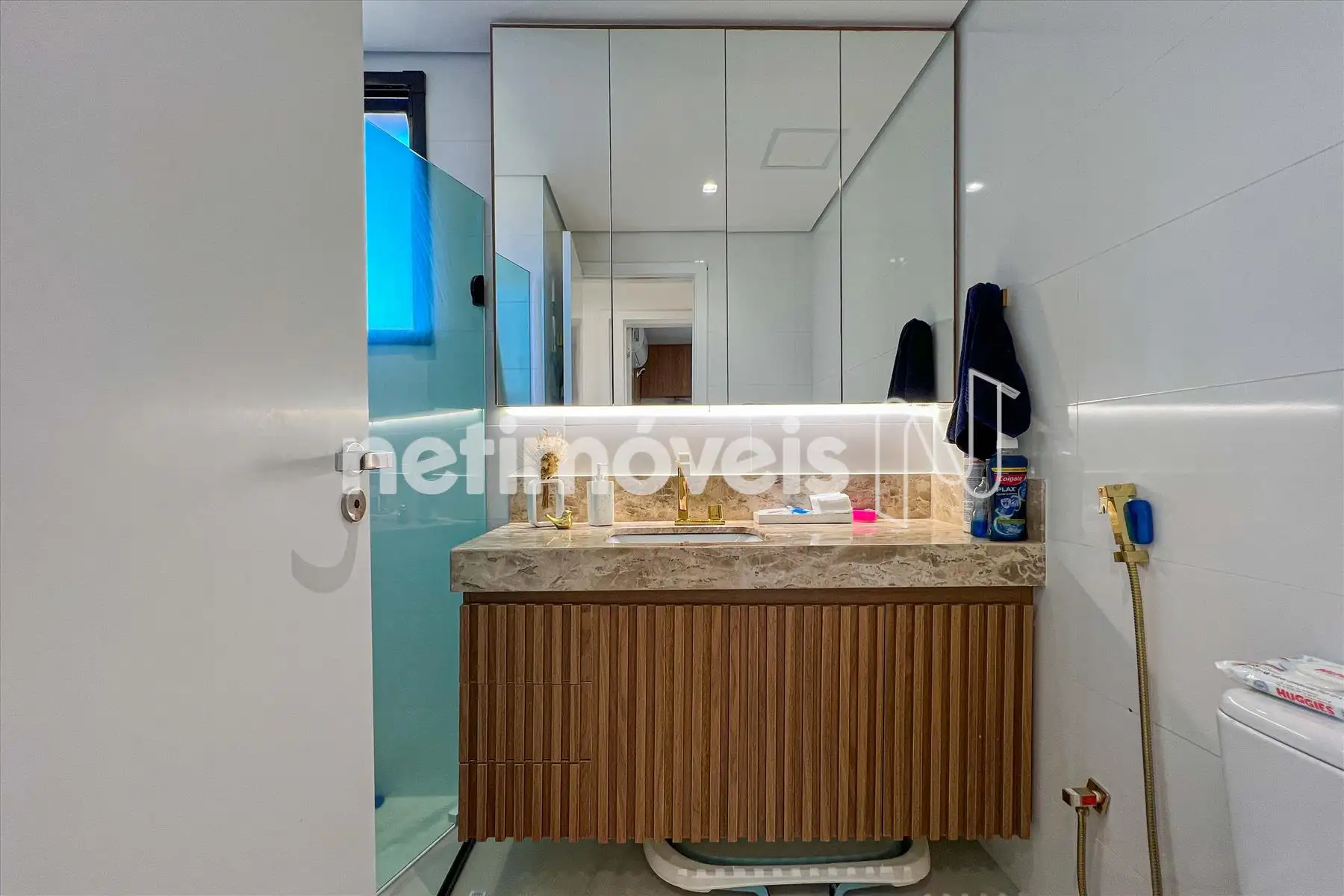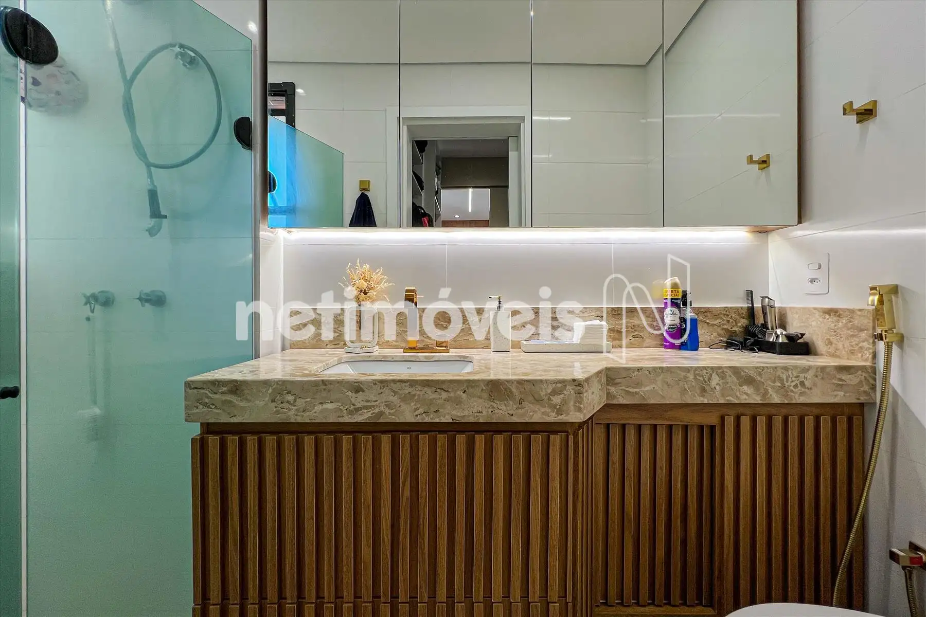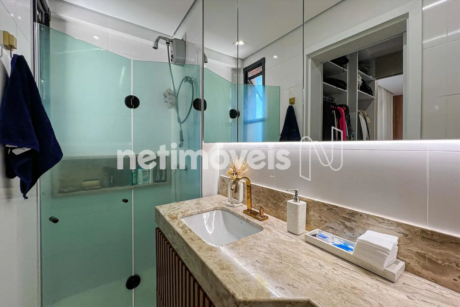 - Banhos suíte e social com piso em porcelanato , pia com bancada em nanoglass com armário e box em vidro temperado .