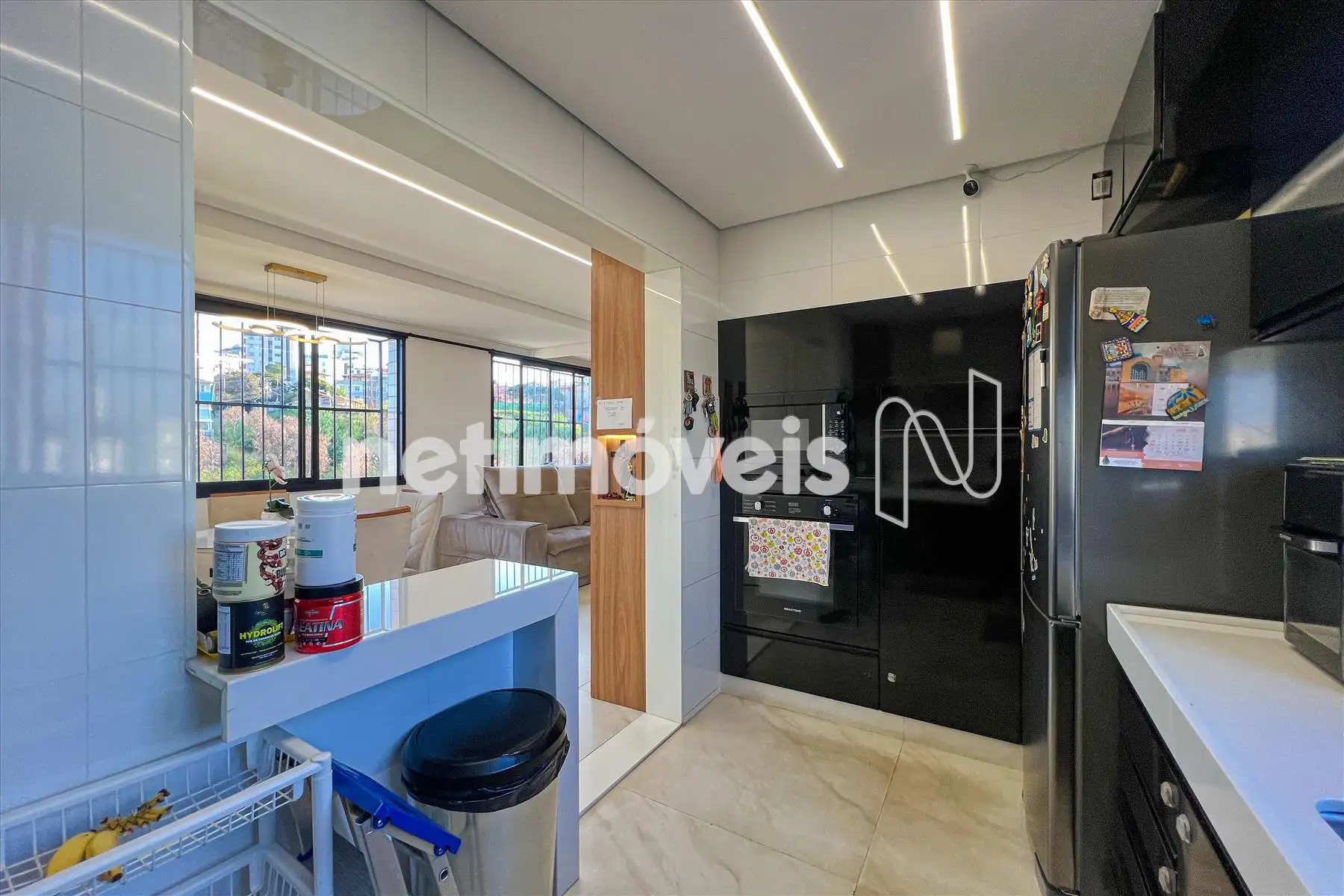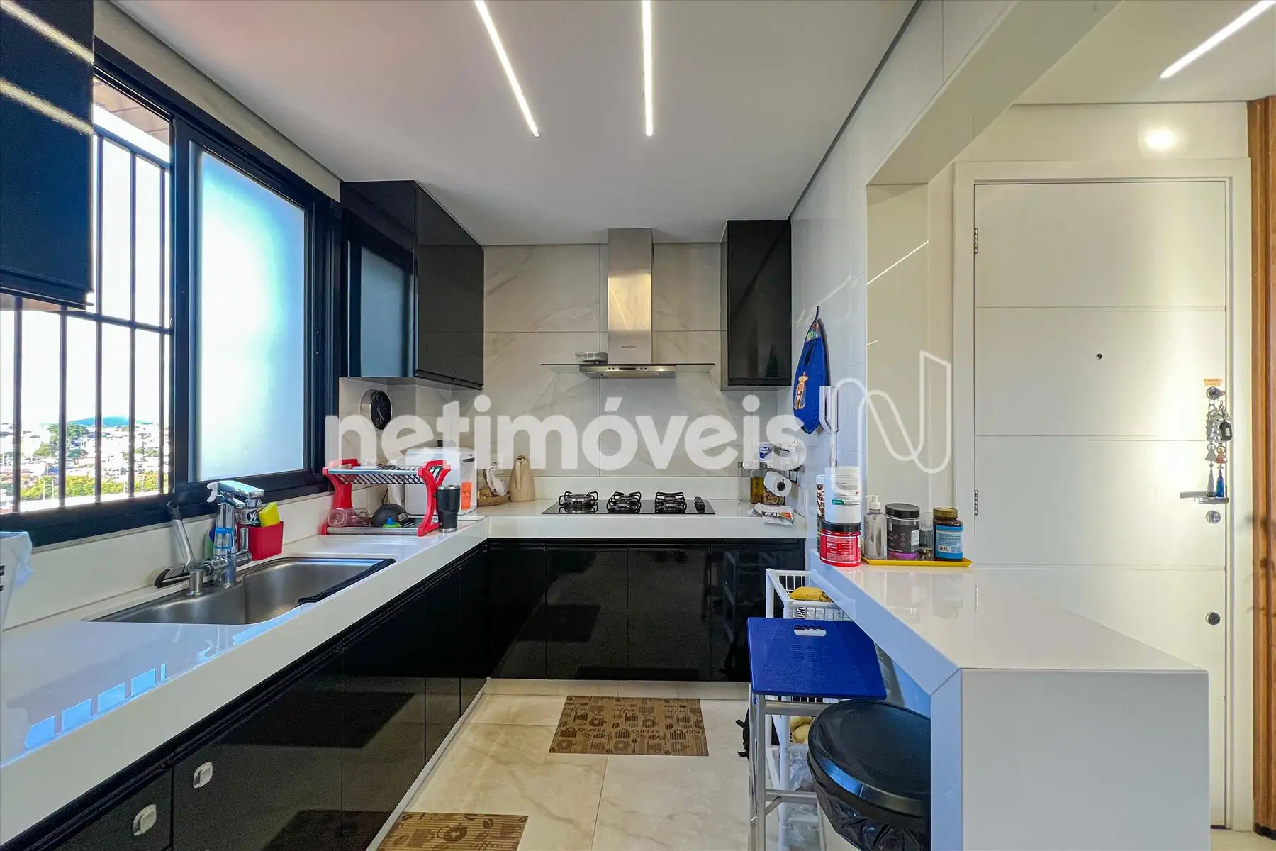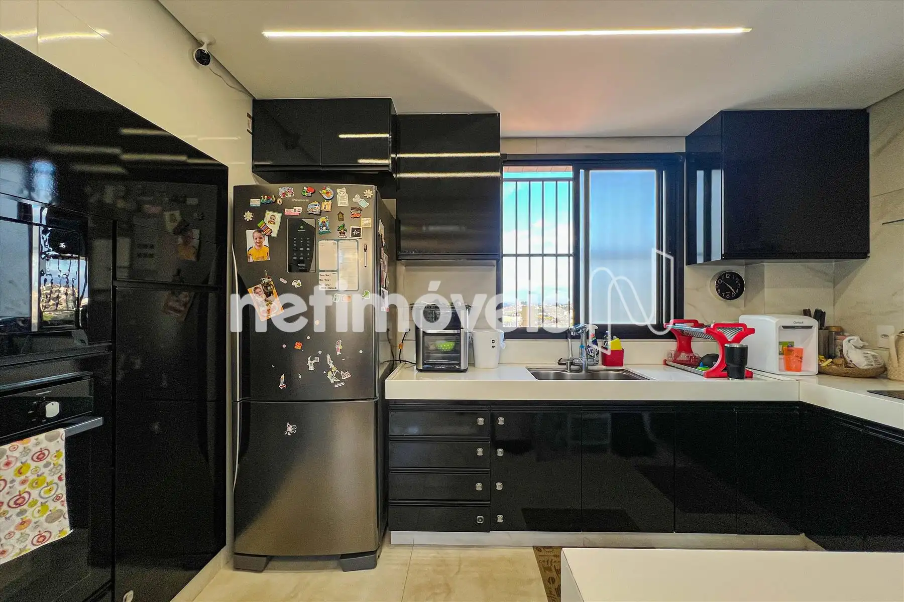 - Cozinha americana com piso em porcelanato , bancadas em nanoglass , rica em armários planejados com fogão cooktop , coifa , microondas e forno .