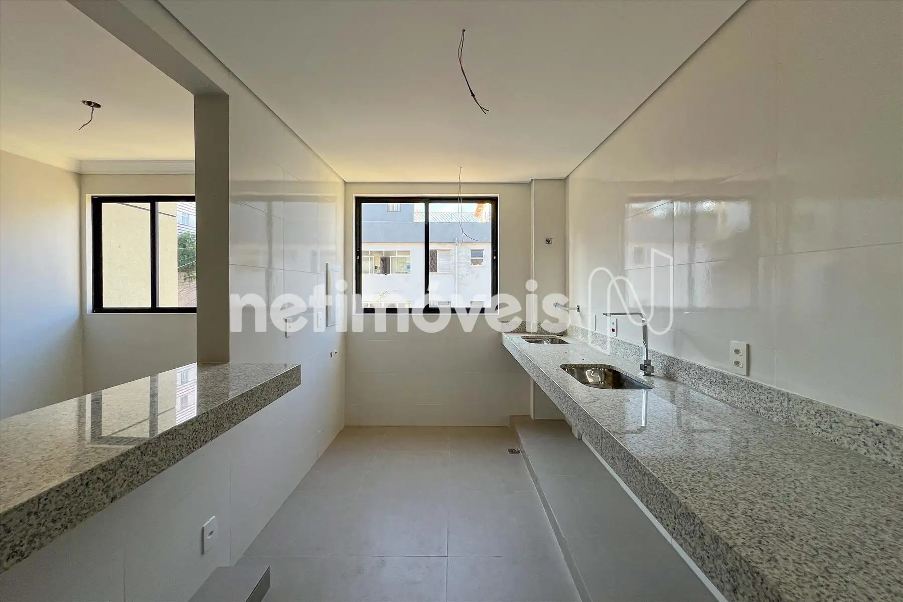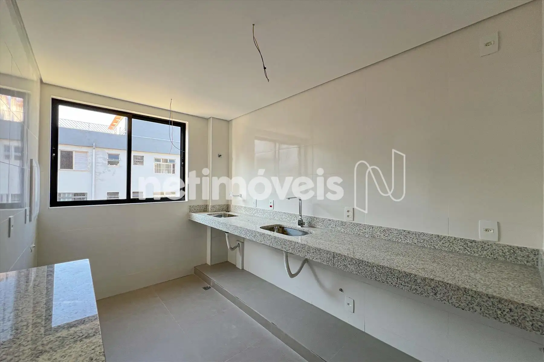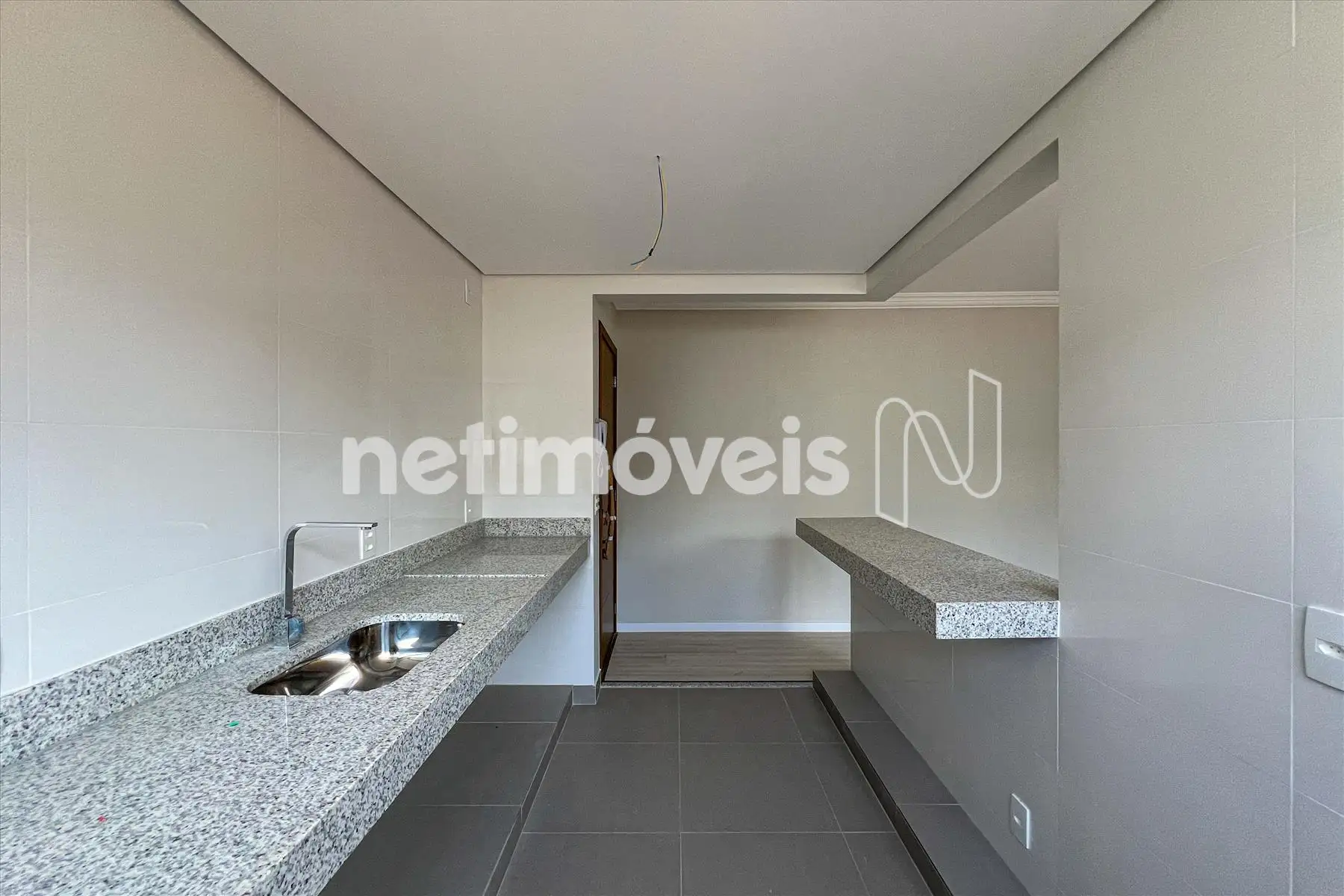 Cozinha em estilo americano piso em porcelanato, bancada em granito,