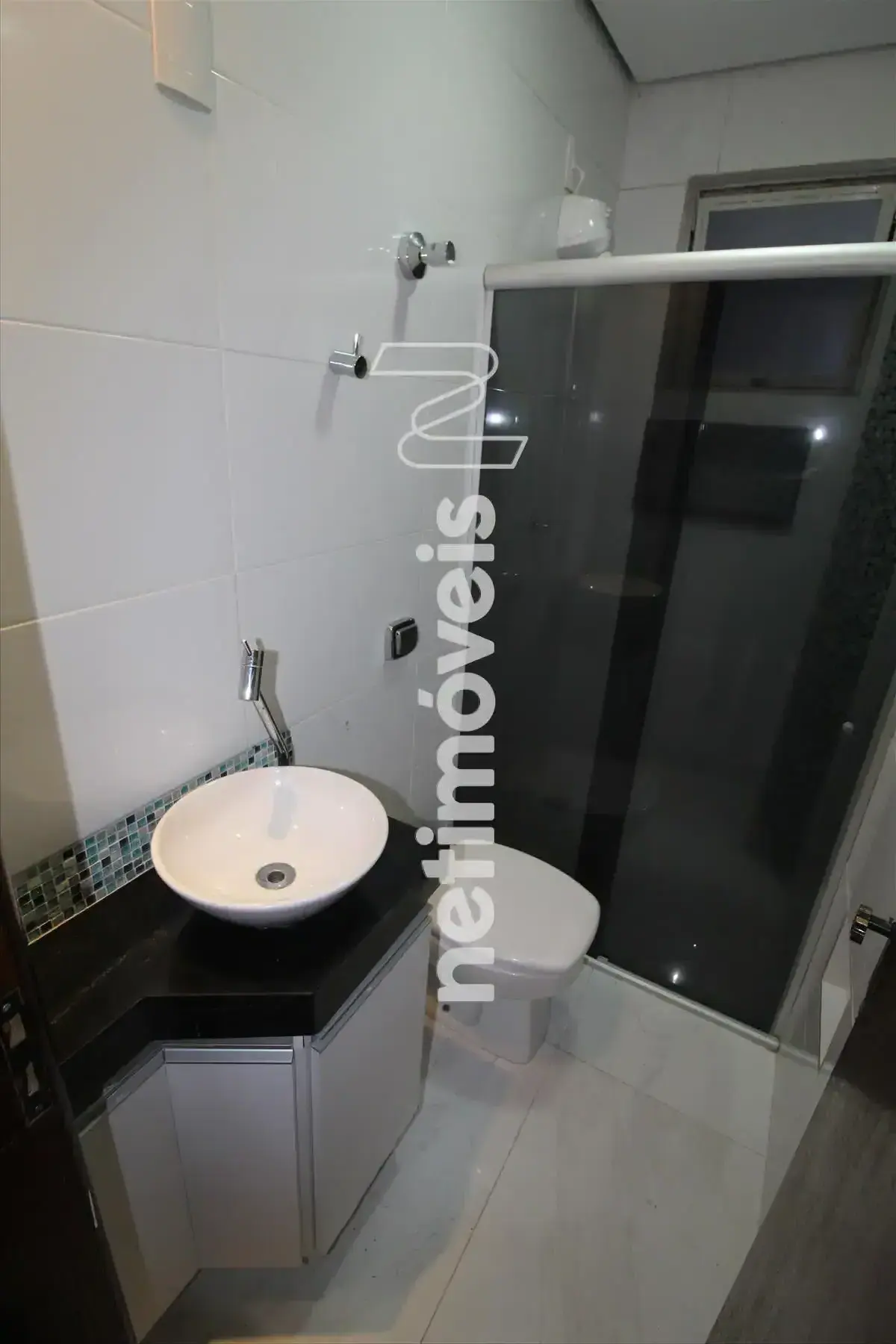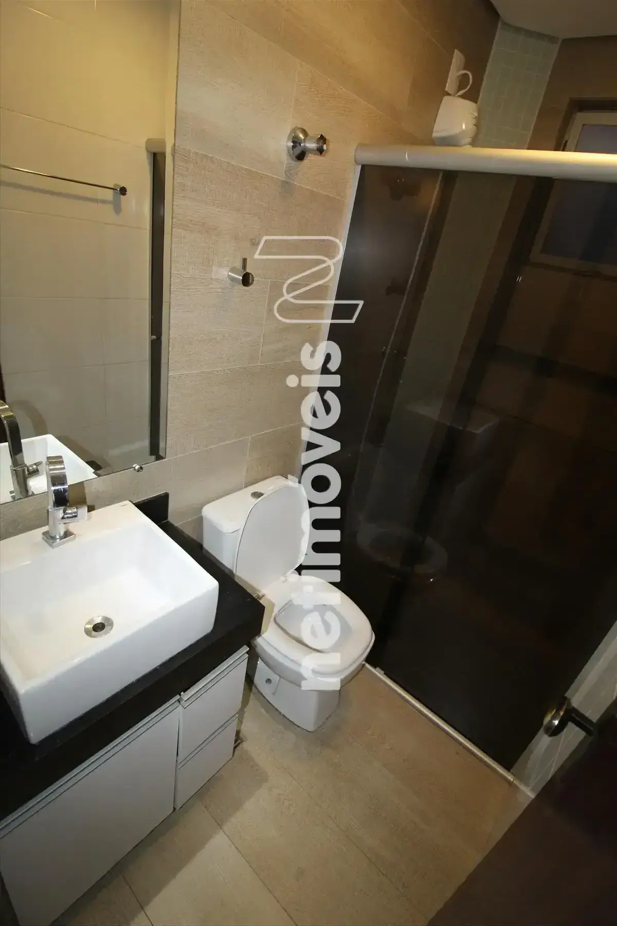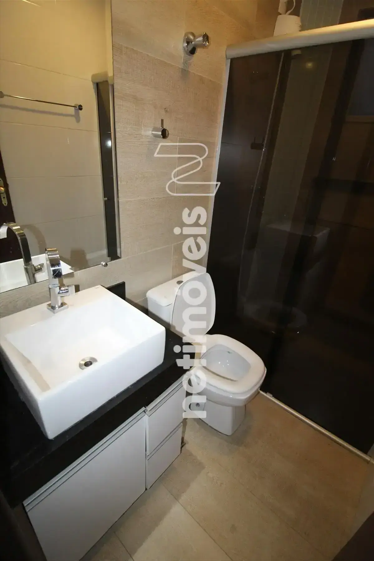 Banheiro social com armários e box blindex
