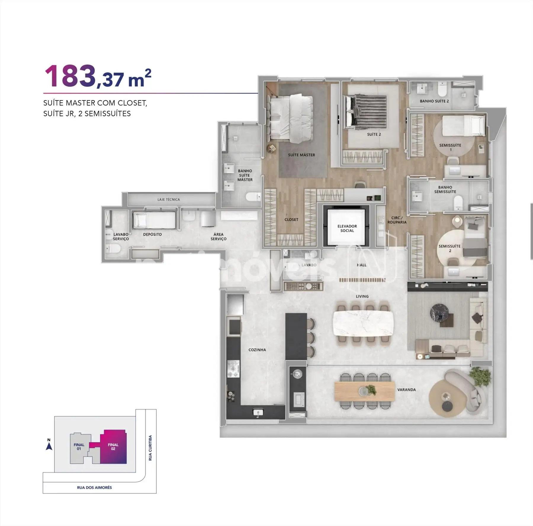 • Apartamentos de 4 quartos com 183,37m², incluindo 1 suíte master com closet, 1 suíte júnior e 2 semissuítes.