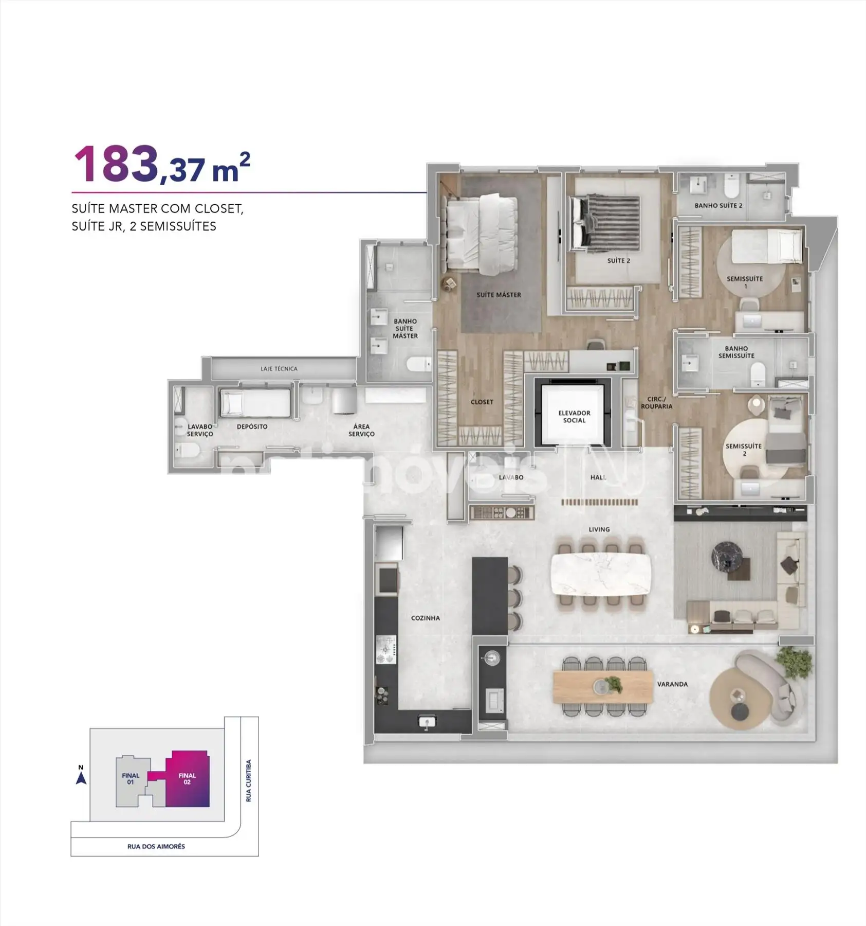 • Apartamentos de 4 quartos com 183,37m², incluindo 1 suíte master com closet, 1 suíte júnior e 2 semissuítes.