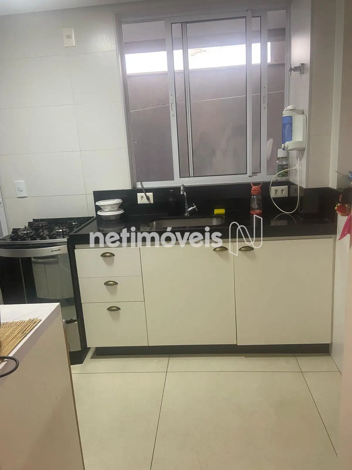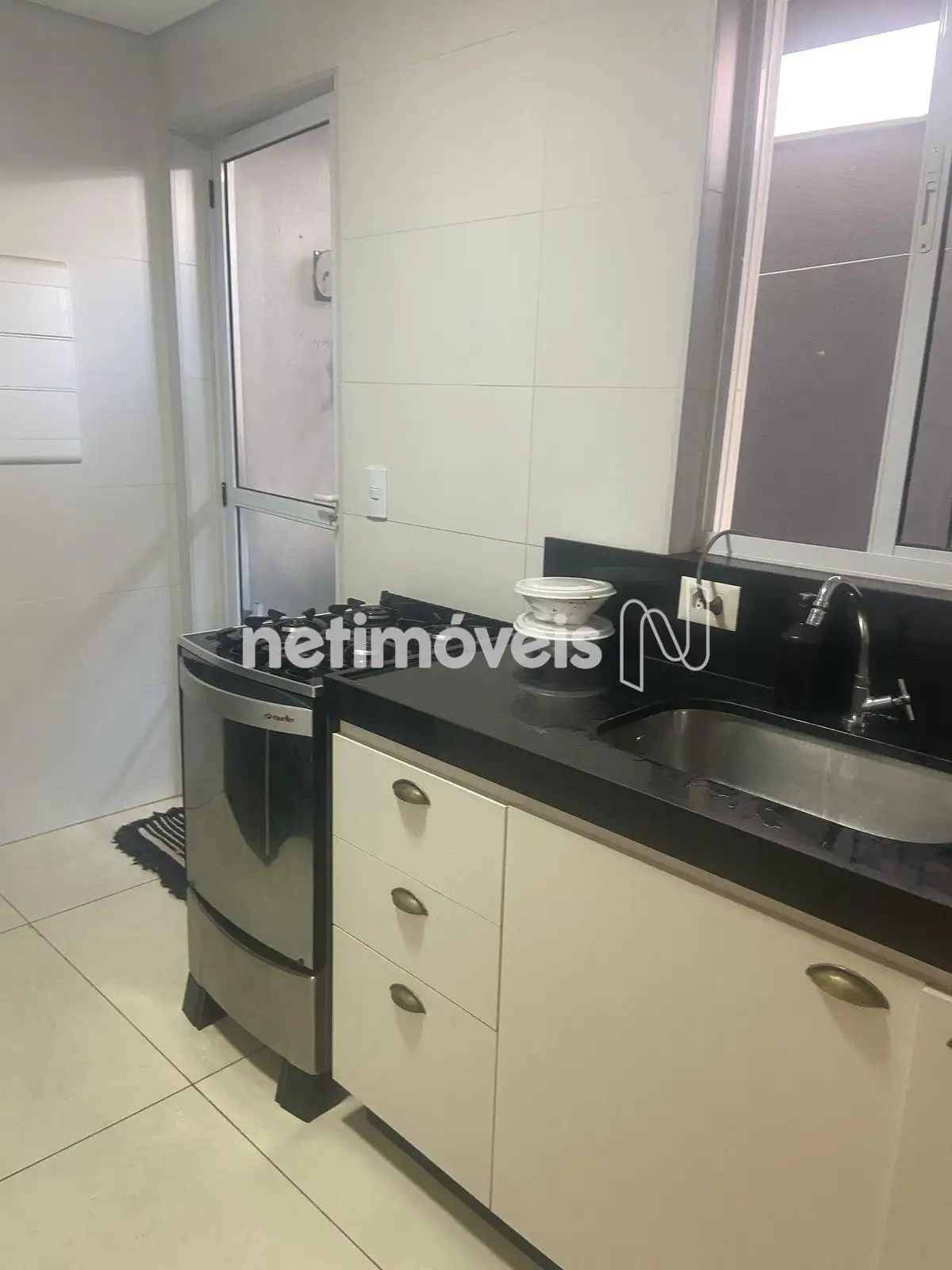 Cozinha com armários, piso e bancada em granito.