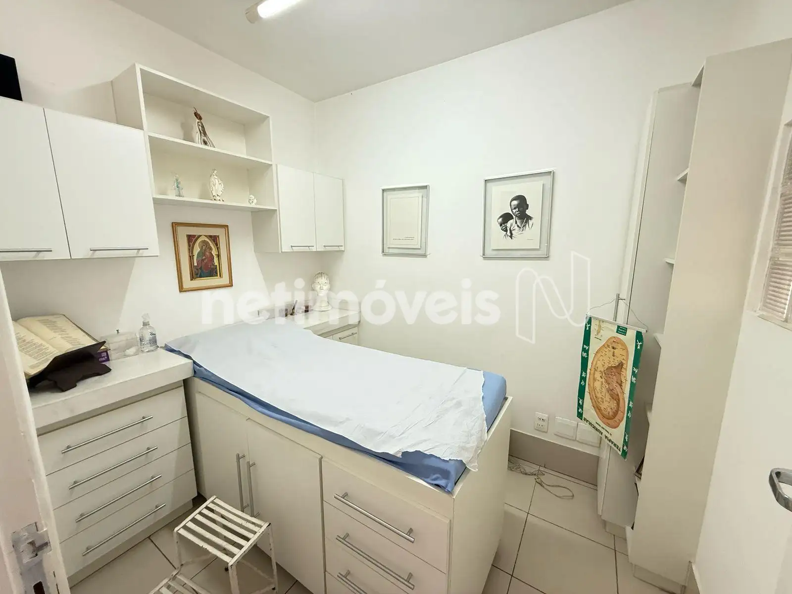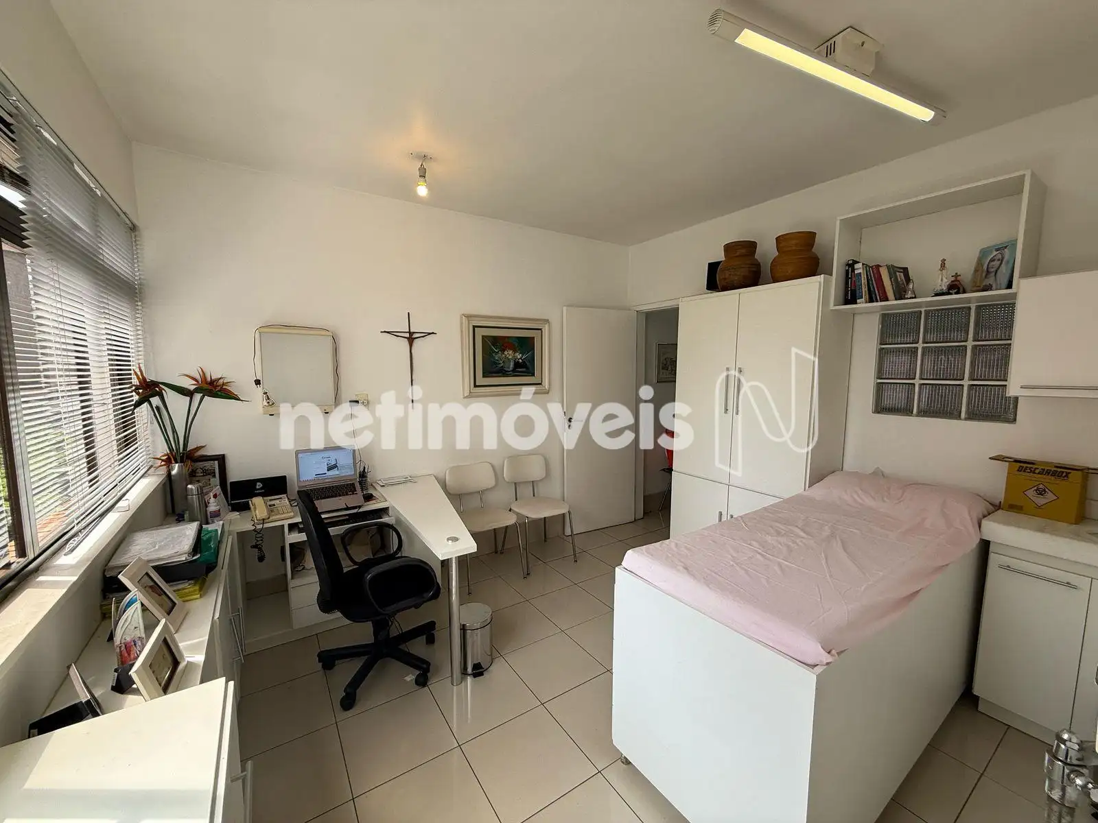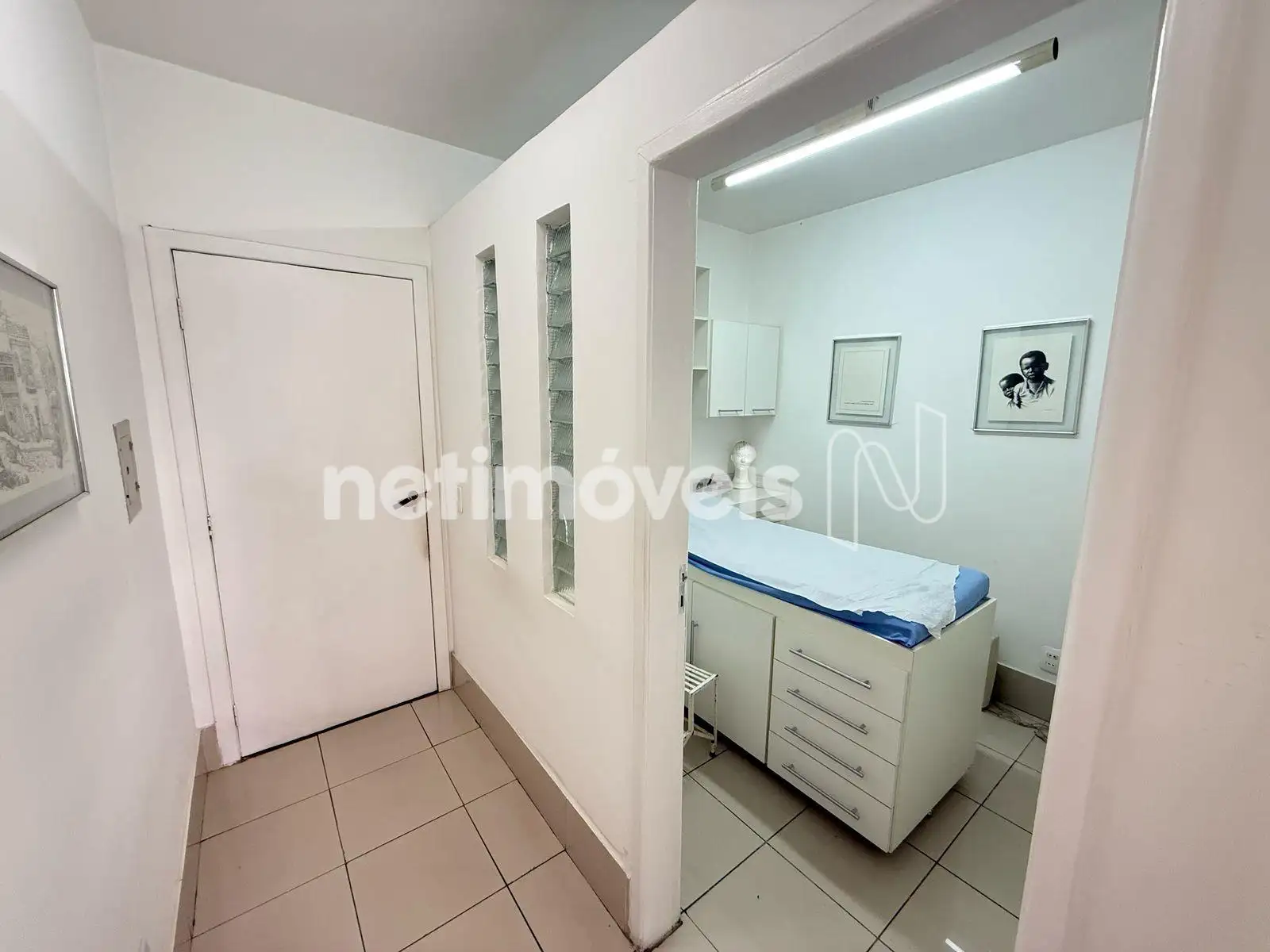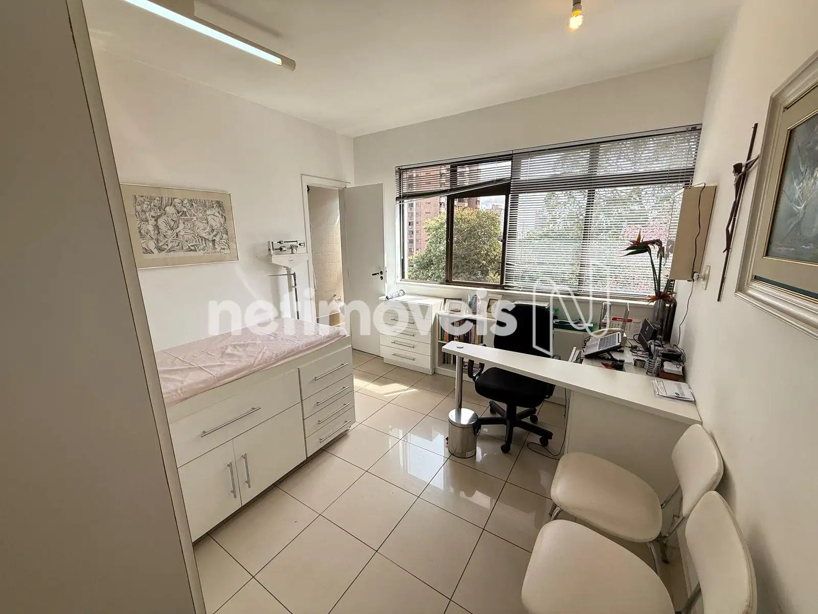 Sala dividida com uma ante sala para exames e consultório no final com banheiro.