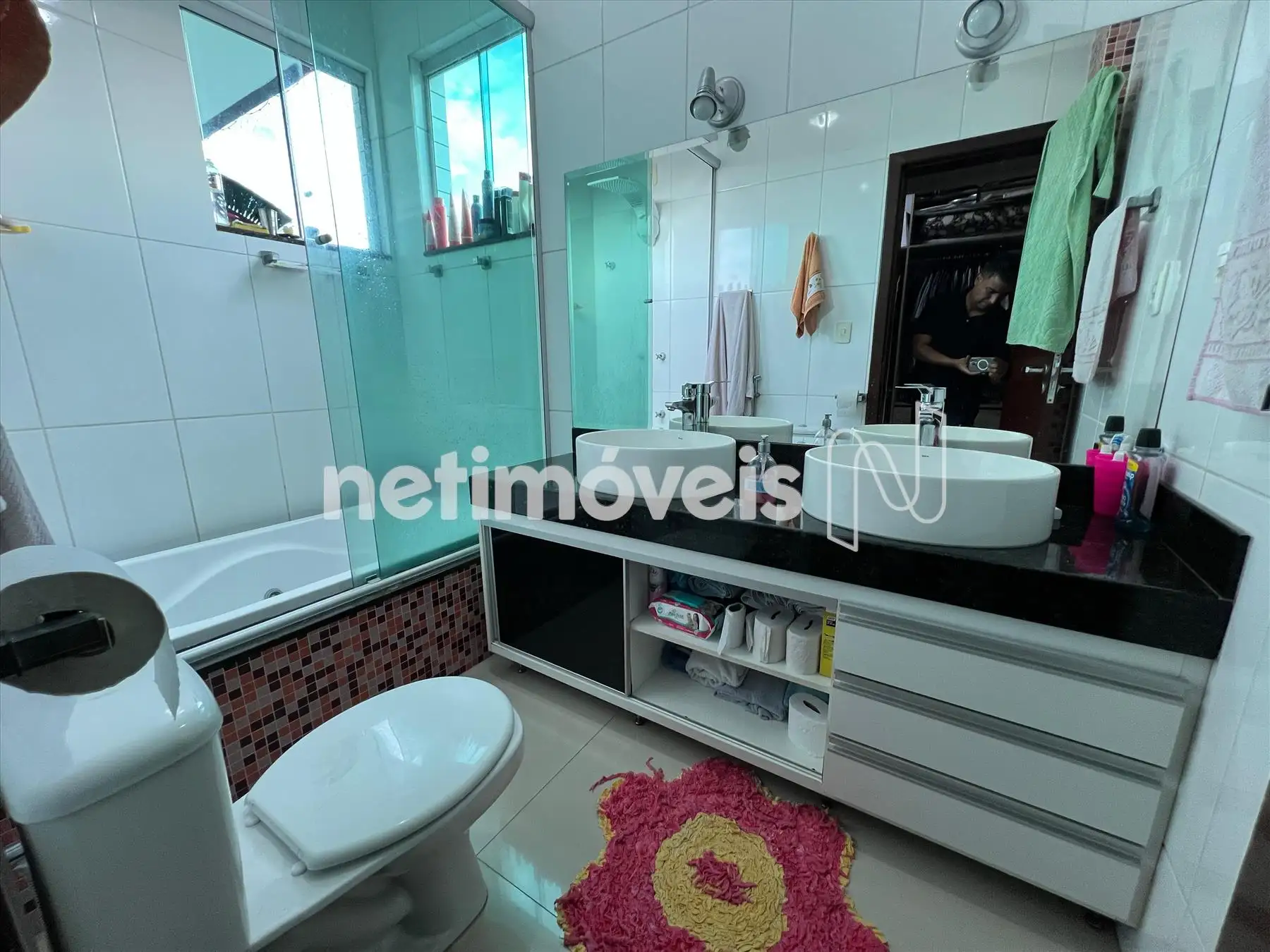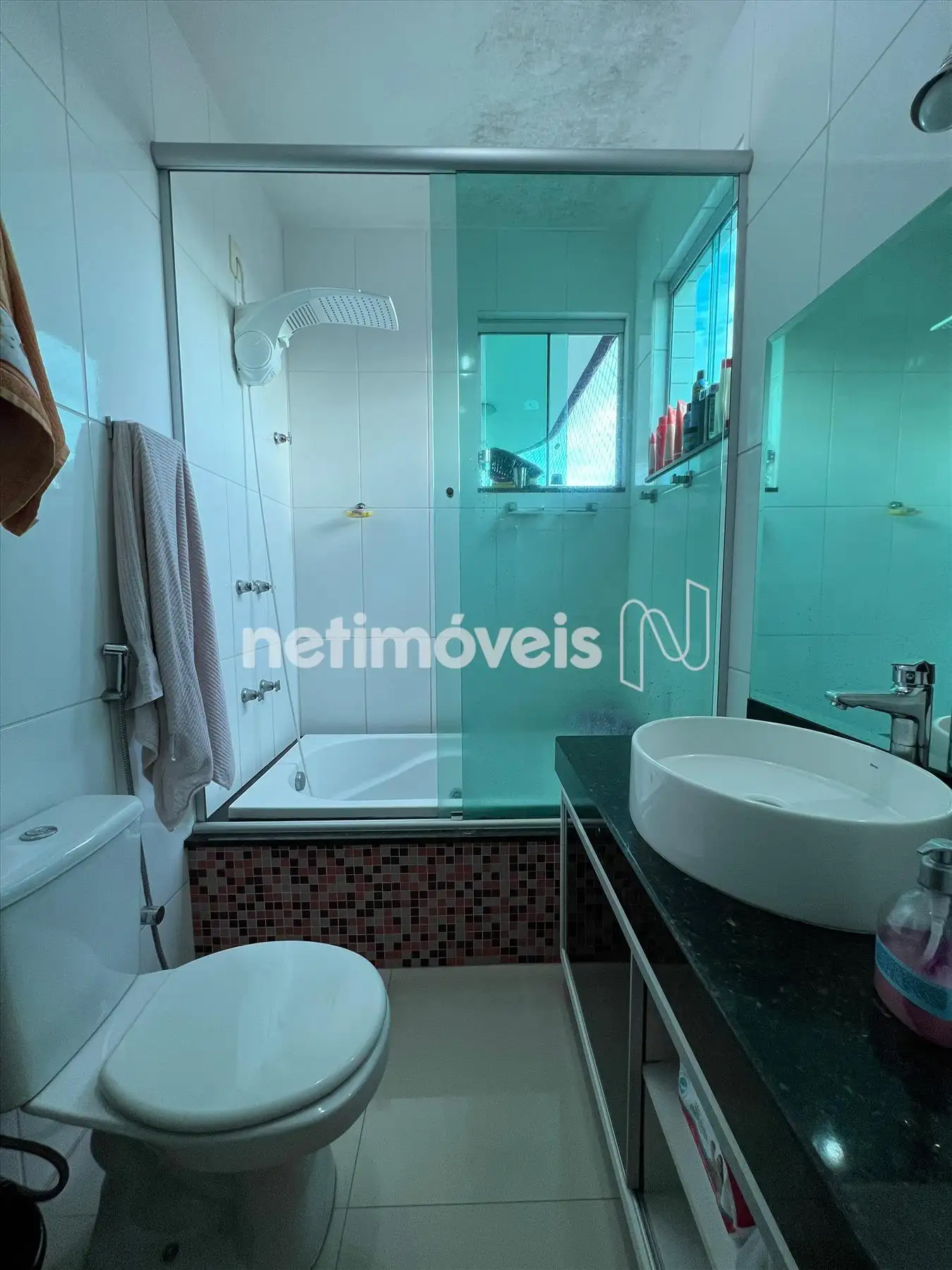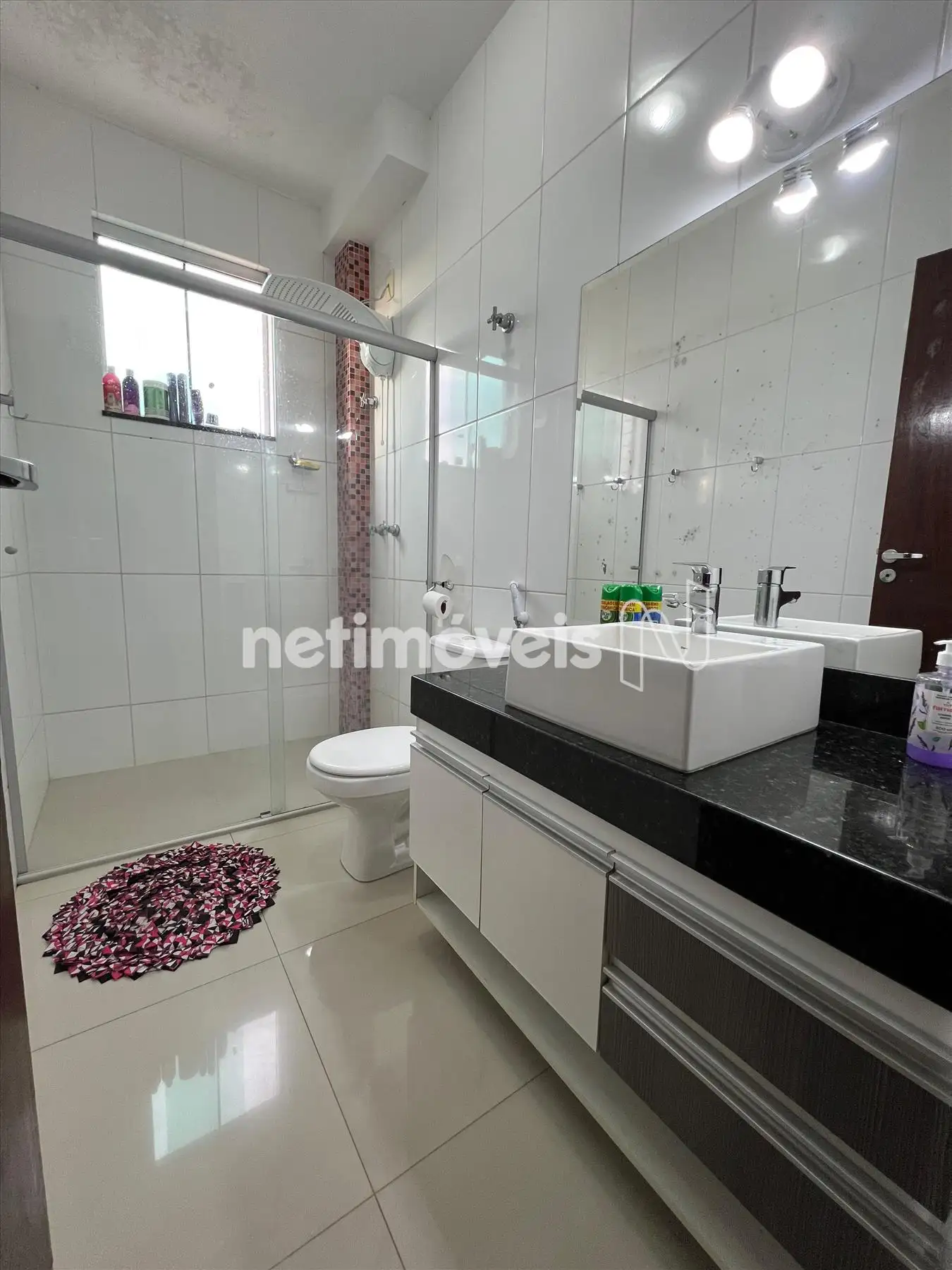 Banho social todo revestido, bancadas em granito e box em blindex