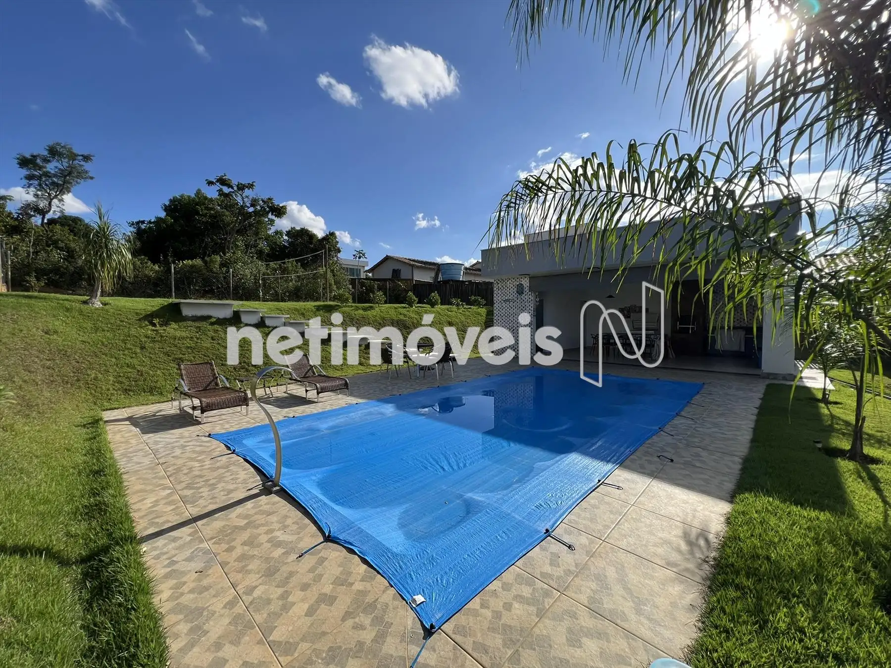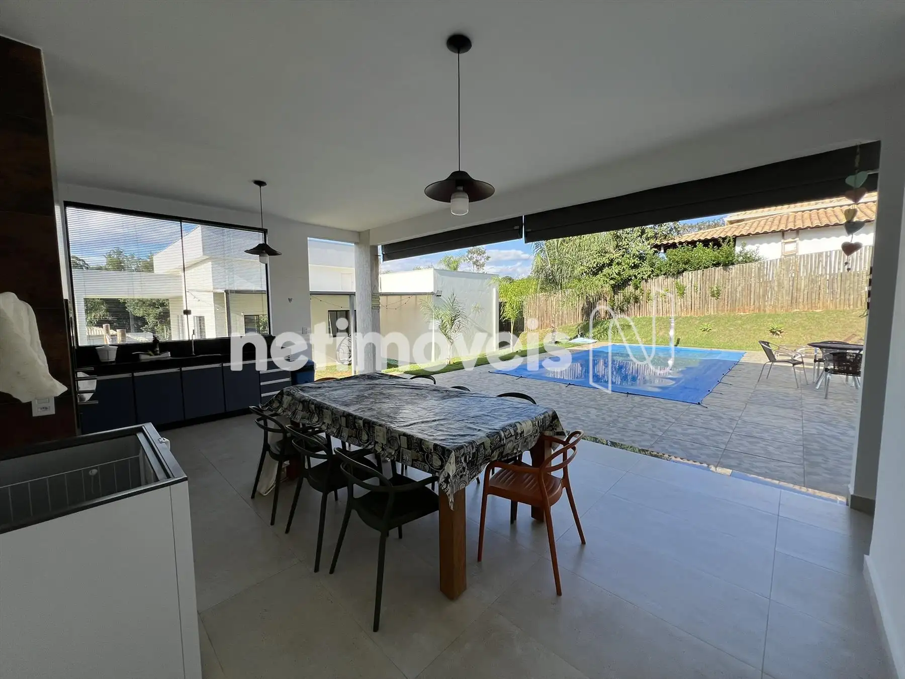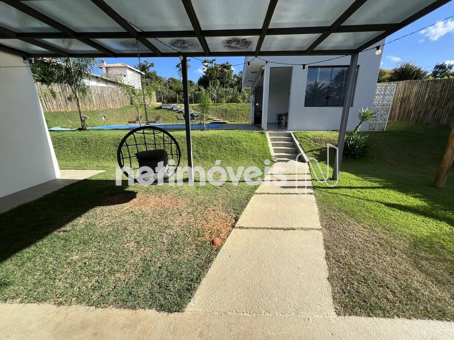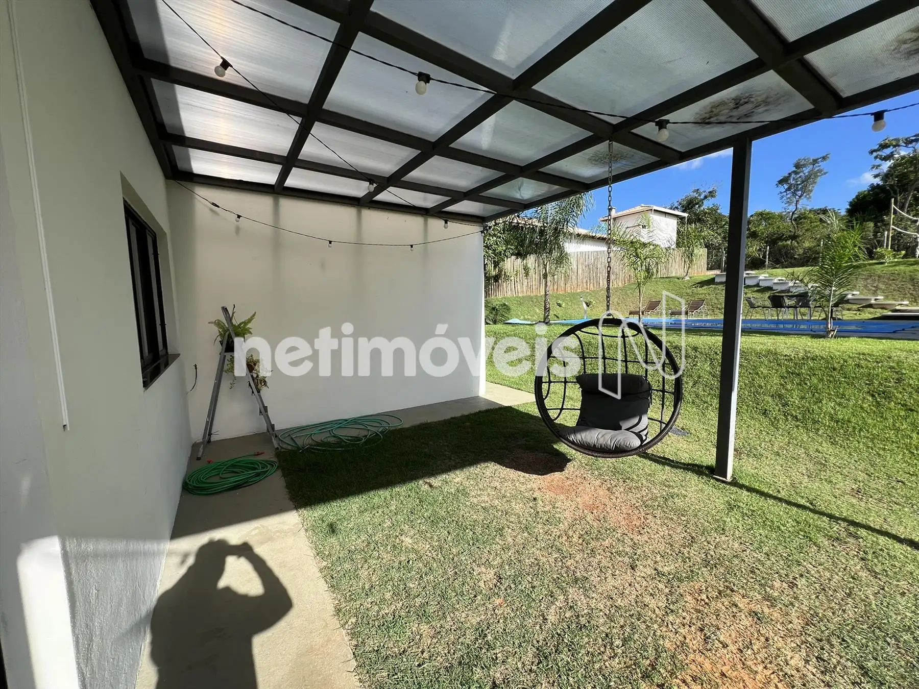 Espaço gourmet, churrasqueira com bancada de granito e armários, piscina, pergolado, campinho gramado e toda casa feito paisagismo
